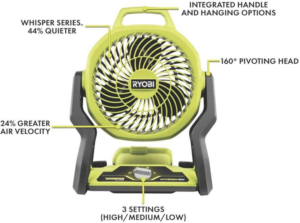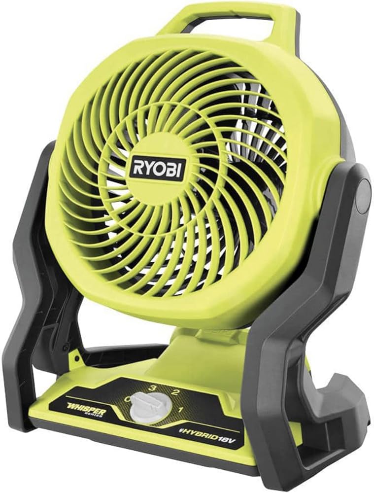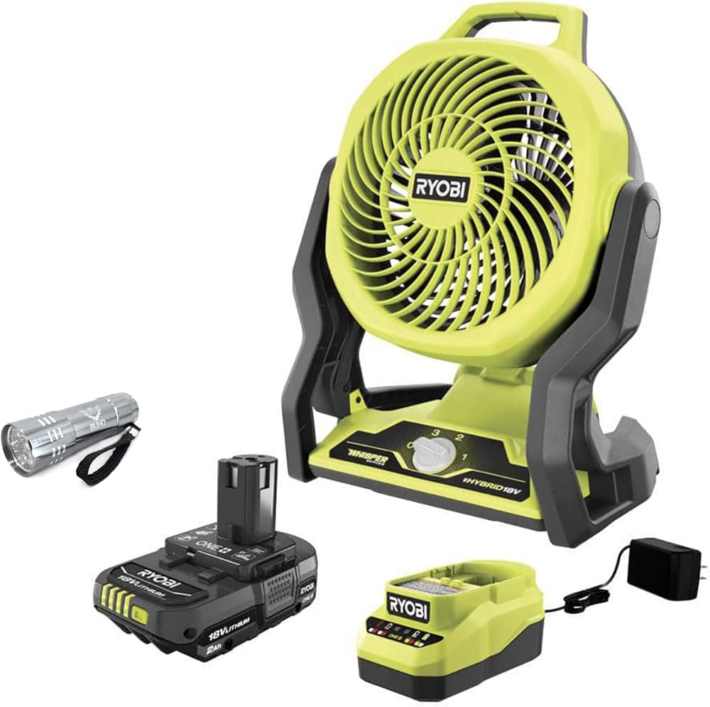 Buho Portable Fan Bundle with Ryobi 18V Cordless Hybrid Whisper Series 7-1/2 inch Fan, 2.0 Ah Battery, 18-Volt Charger Flashlight