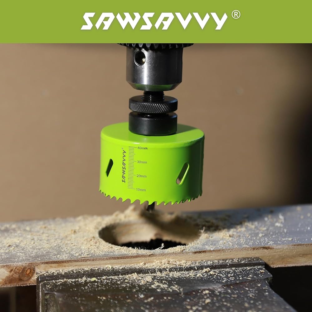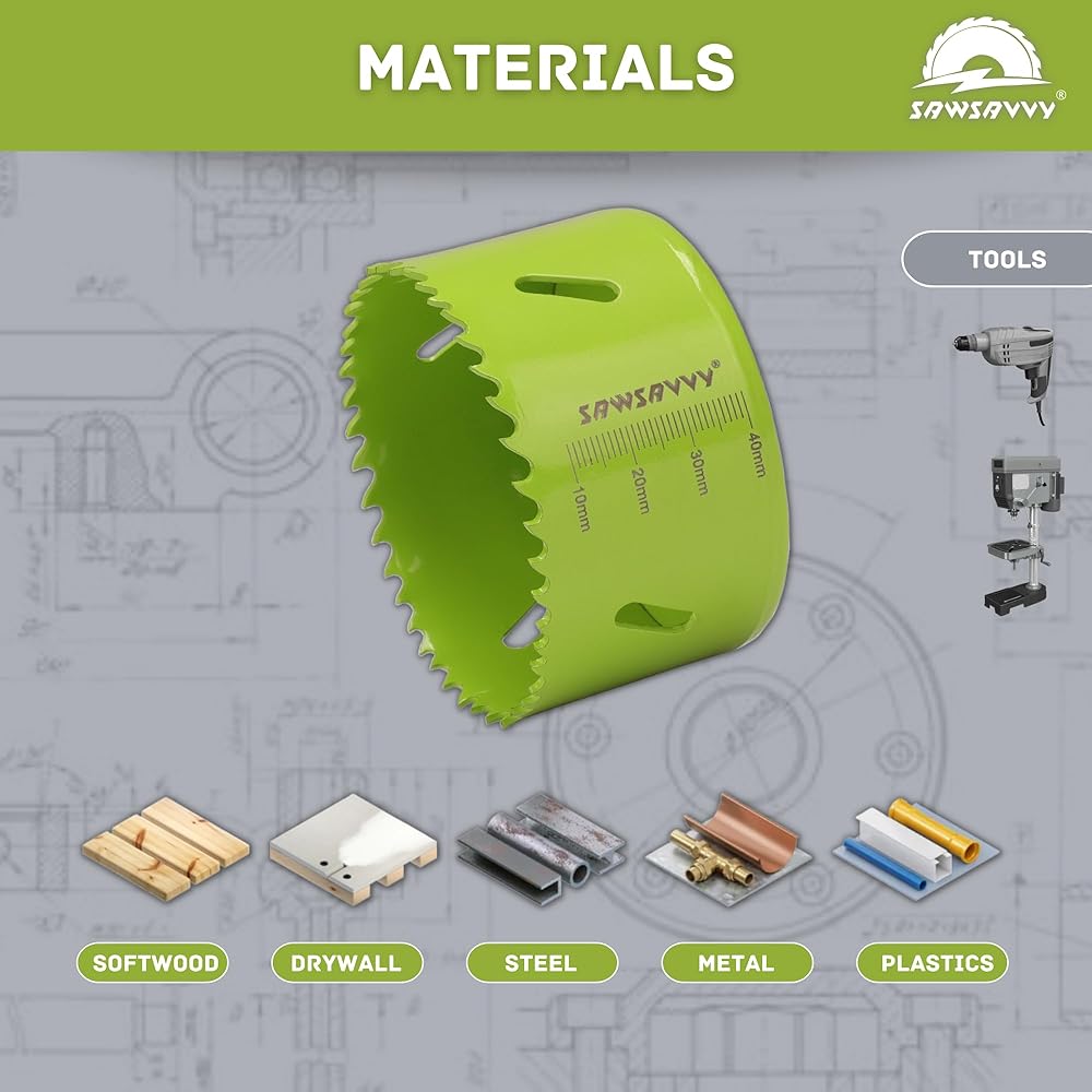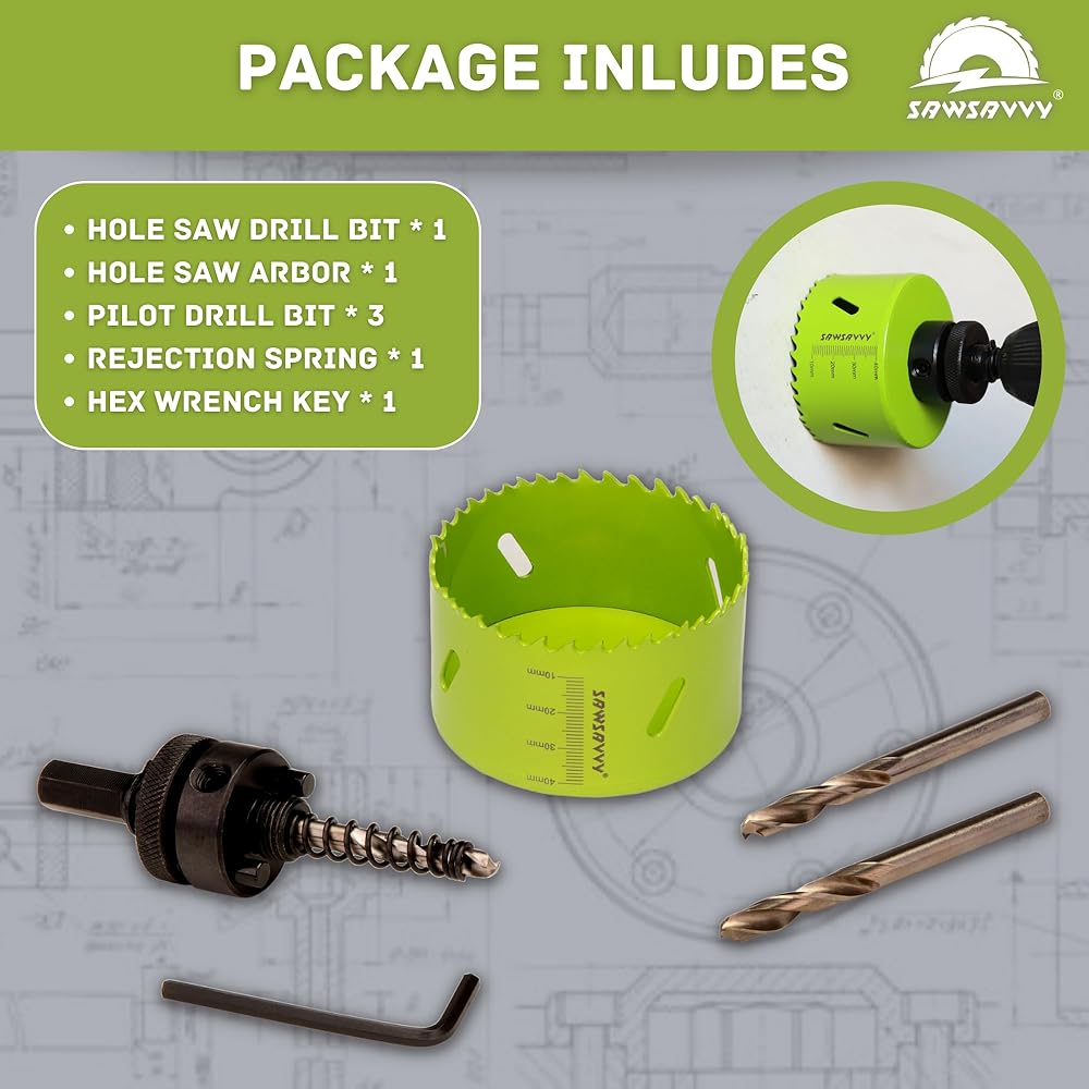4.25 inch Hole Saw for Wood Metal Drywall, Hole Saw Drill Bit, Bi-Metal Hole Cutter with Hex Shank Pilot Drill Bit Adapter, 4 1/4 Hole Saw (51mm), 1 5/8 inch Cutting Depth 🔥 SAWSAVVY 4.25 inch Hole saw is made of bi-metal HSS containing 8% cobalt alloy for long-lasting cutting., higher toughness, higher cutting strength, and stronger wear resistance. Also, Built rust-proof for repeat use. It also provides strong durability in terms of flexiblility, and shatter resistant steel body for long life. Its tooth configuration (Vario tooth strip) is ideal for gliding through material to provide smooth cuts. 🔥 SAWSAVVY Hole saw has a new design of 40 mm (1-5/8 in.) cutting depth for 30% deeper holes in 1 pass and increased productivity than other products on the market. In addition to that, specific measurement engraved on the hole saw drill bit is for convenient identification of drilling depth. 10-40 mm in an incretment of 10mm (3/8 in.) 🔥 This hole saw can cut a hole which is 4-1/4 inch diameter in wood, plywood, plastic, drywall, soft plaster, cornhole boards, acrylic-board, thin metals (within 1/4 inch), and etc. In addition, SAWSAVVY 4 1/4 inch hole saw is suitable tocut holes for recessed lights or canned lights, this hole saw is also suitable for home projects on air ducts, speakers, ceiling lamps, etc. 🔥 SAWSAVVY 4.25 Hole saw package includes: 1 x 4.25" hole saw, 1 x 7/16" hex shank arbor, 3 x 1/4" pilot bits, 1 x 5/32" allen wrench key, 1 x strong rejection spring. Keep the drill bit in contact with the cutting surface straight at a low speed. Take some time for the saw to cut, so you can get a smooth and clean round cut.