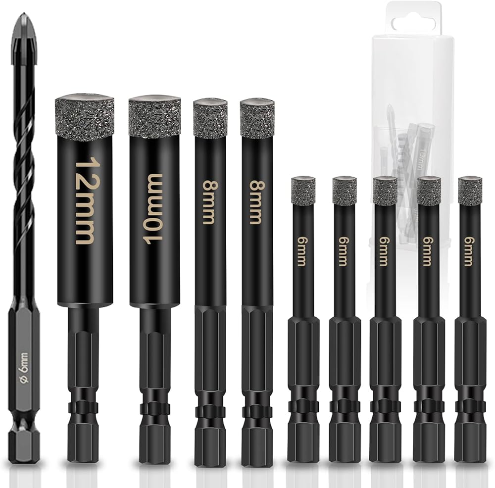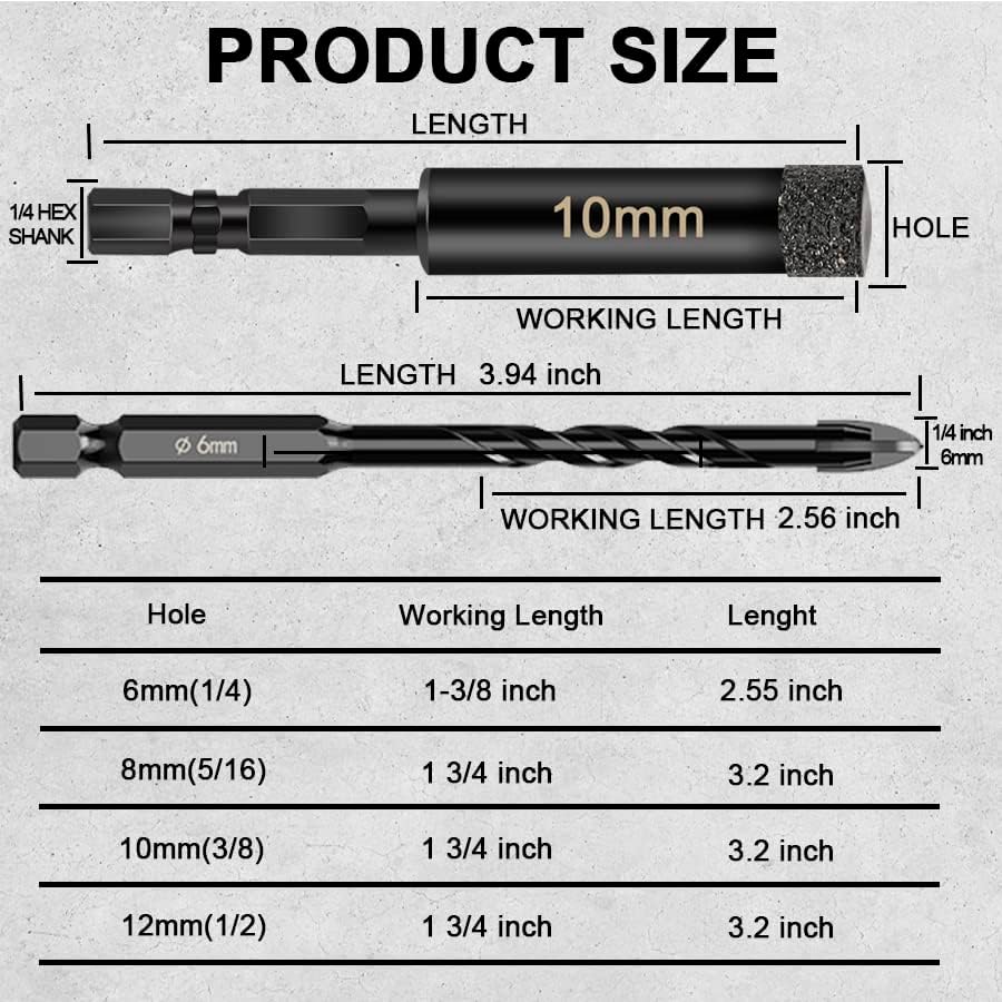 🛠️【1/4 inch to 1/2 DIFFERENT HOLE in PORCELAIN GLASS】: 11 pieces tile drill bits ceramic diamond for drilling holes diameter of 1/4 inch(6mm), 5/16inch (8mm), 3/8inch (10mm) and 1/2inch (12mm).Compare to other porcelain drill bits include 6mm only, our diamond drill bits includes more size to drill different holes to meet us daily use. The ceramic tile drill bits depth is 2 inch, please don't drill holes beyond 2"