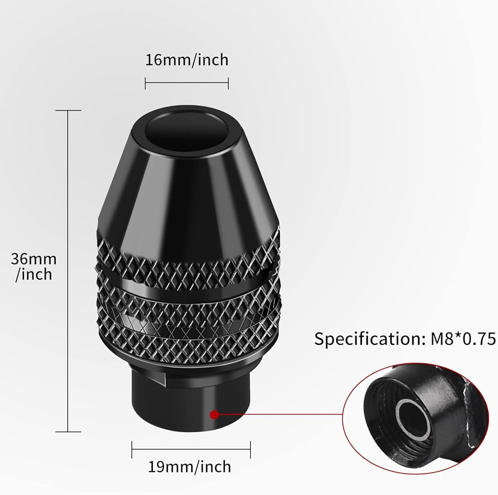Goxawee Keyless chuck is made by superior material, which can hold the bit shank from 1/8 inch to 1/64 inch steady. It is suitable for most Goxawee brand rotary tool, like model G4007, G4115, etc. If you need to apply to rotary tool from other brand, check the specification before use, it may not match. For your safety, please make sure the bit is hold in central and align to the chuck port.