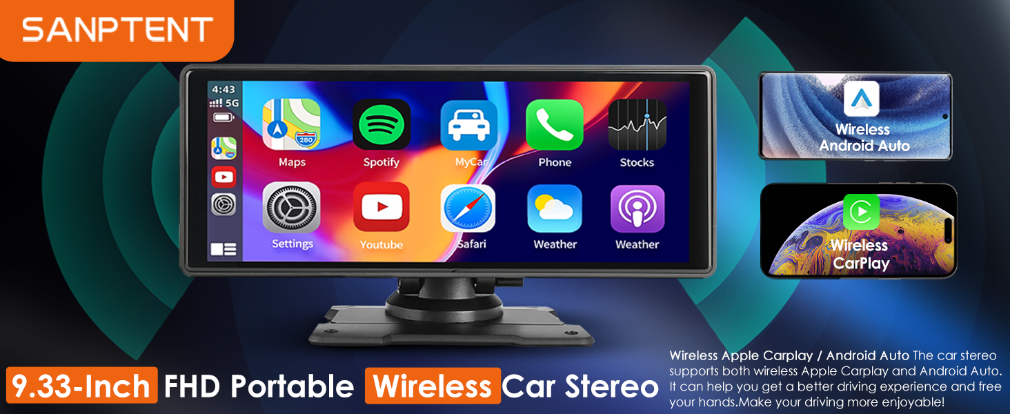 SANPTENT Wireless Apple CarPlay Dash Mount Portable Car Stereo, Android Auto, 9.33-Inch FHD Touchscreen Car Audio Receiver, Drivemate, Car Buddy with Voice Control, AUX/AV IN/USB, AHD Rear View Camera