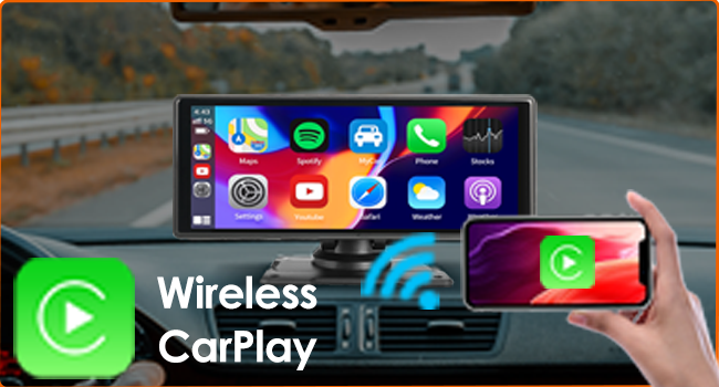 🚙[Wireless Apple CarPlay & Android Auto] By connecting your phone to your car play screen using Bluetooth and Wi-Fi, you can easily access your phone's music, navigation, messages, and other features wirelessly while driving safely. This allows you to utilize Apple CarPlay and Android Auto without the need for cables. Additionally, you can use voice control through Siri or Google Assistant without touching the screen, enabling a safer and more comfortable driving experience.