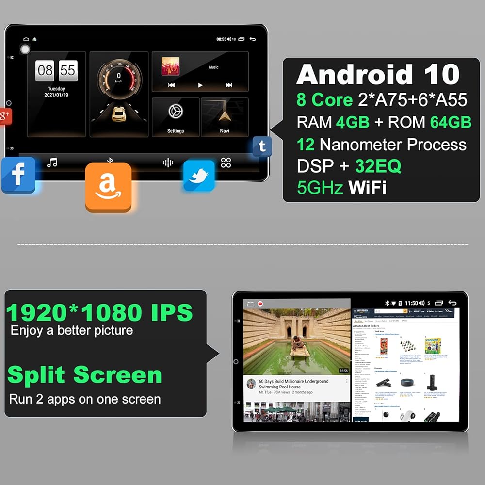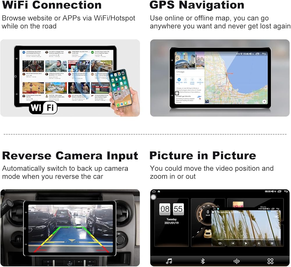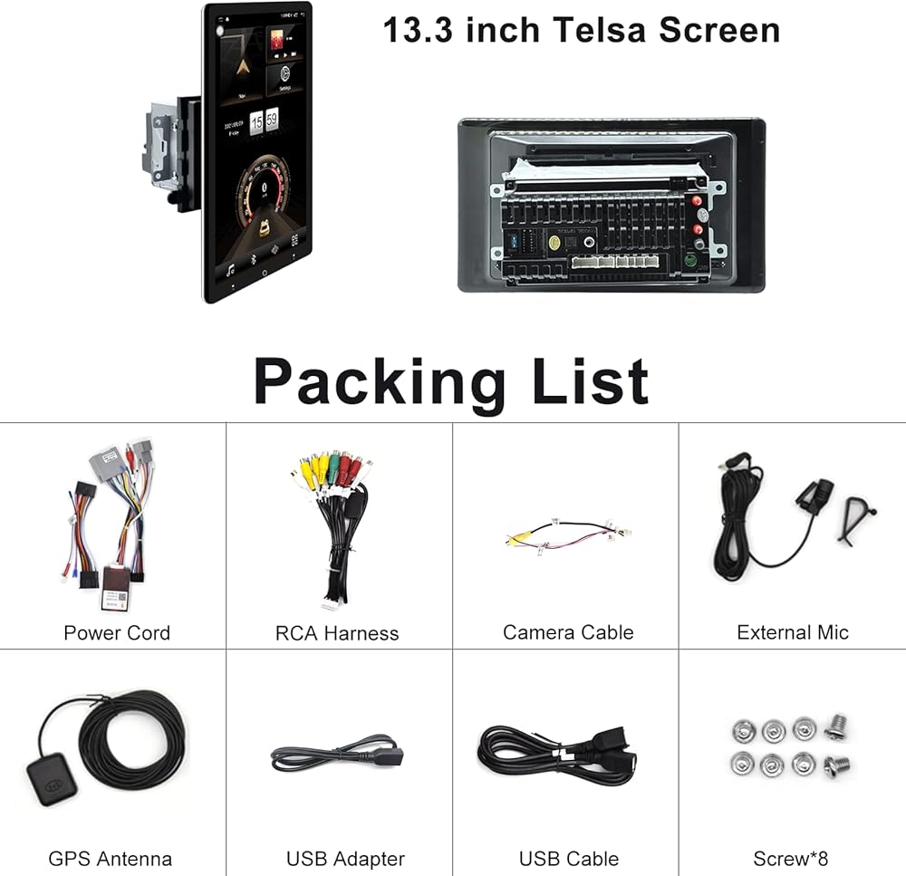 【Android 10.0 Car Stereo Multimedia System】 The double din car radio with android 10.0, Octa Core CPU with 4GB RAM & 64GB ROM, 13.3 inch 1920*1080 IPS touchscreen, works with Apple Carplay & Android Auto, AM/FM radio, Bluetooth (phonebook sync, hands-free call and music stream), Split Screen (run two apps on one screen), Steering Wheel Control, GPS Navigation, 2 USB ports, support rear view camera, WiFi connection, you can download thousands of apps (YouTube, FB, Spotify etc).