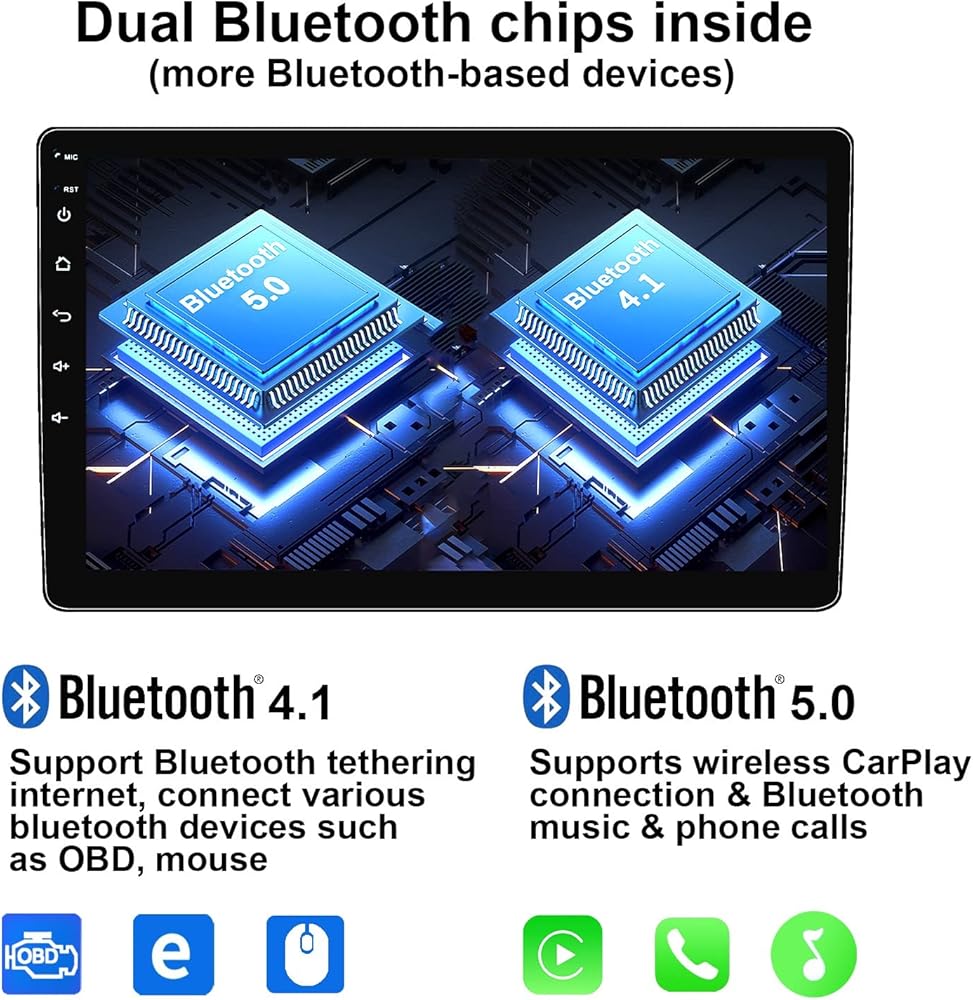 【CarPlay Head Unit with Dual Bluetooth】 BT1 5.0 and BT2 4.1 allow to have multi-connections with your phone and other Bluetooth devices meanwhile. BT1 works as wireless CarPlay connection & Bluetooth hands-free calls & music streaming. BT2 can connect to a phone Bluetooth to get internet or Bluetooth device such as OBD2 to scan or read engine codes.