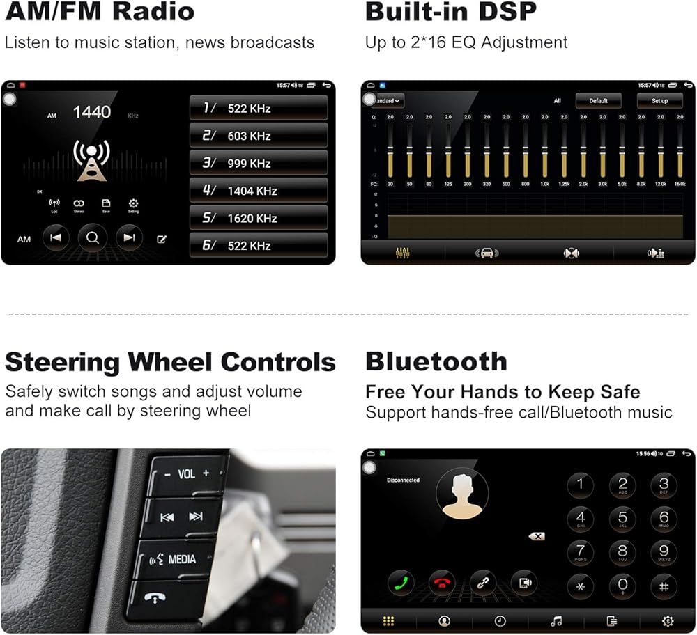 【Built-in DSP 】 The stereo system features advanced DSP (Digital Signal Processor) technology, you could adjust 4 speakers individually and with 32 Equalizer adjustment to create the sound effects like a live concert and enjoy this sound in the car.