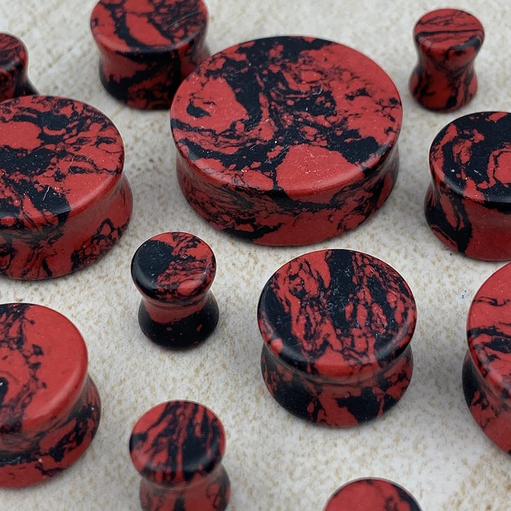 Double Flare Stone Plugs. Made from Synthetic Black and Red Howlite Stone. Sold in pairs. Quantity 1 = 1 pair.
