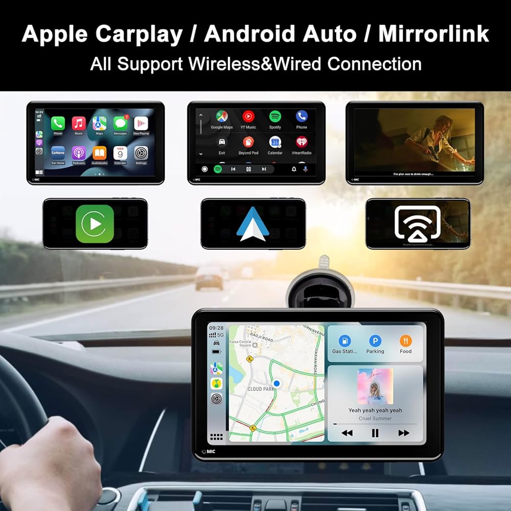 Portable Car Stereo for Apple Carplay, Android Auto, Air Play, Mirror Link, Wireless Car Play Screen with Bluetooth Handsfree, 7 Inch IPS Touchscreen, GPS Car Navigation, Siri/Google, FM/AUX/USB/TF