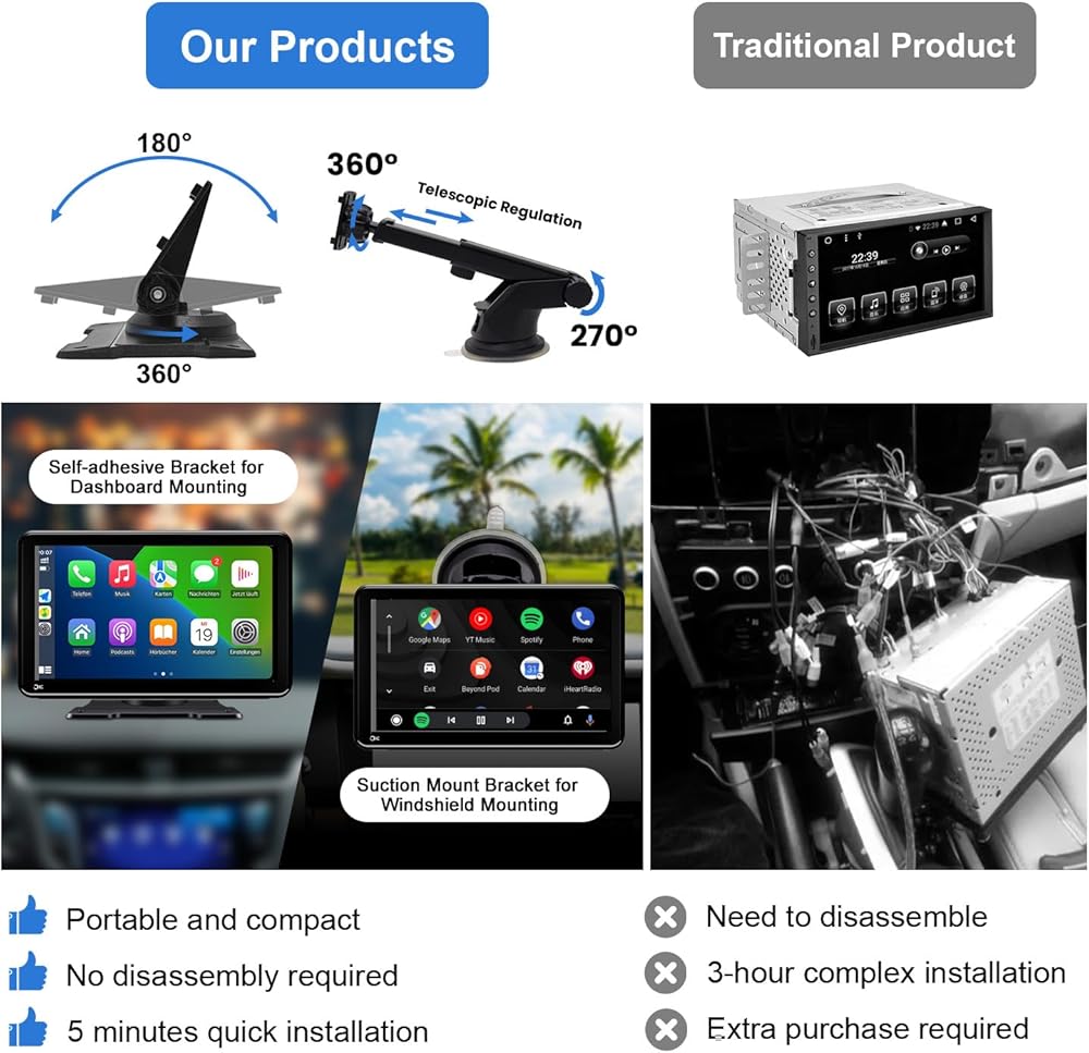 Fits All Vehicles: This portable apple carplay is compatible with all cars or trucks from 12-24V. A self-adhesive bracket and suction cup bracket are included in the package, which can be 360° flexibly rotated-- Up and down, left and right, front and back. With this holder, the machine can be mounted to the windshield or dashboard. No need to disassemble your car, portable installation. 7 inch 1080P Full HD touch screen car play stereo, plug and play!