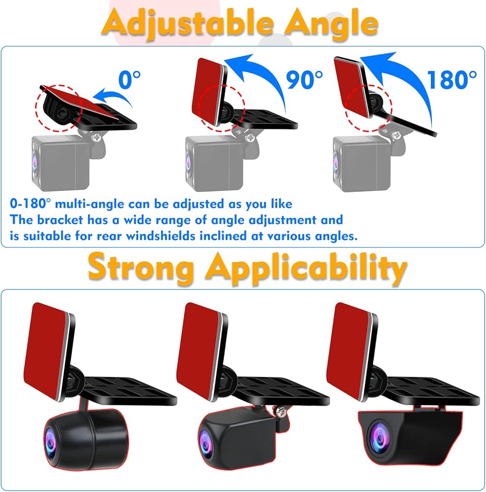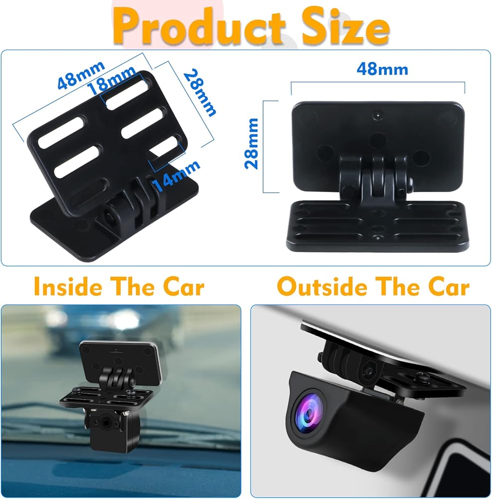 【Compact Design & No Drilling Required】The compact size of the backup camera bracket can securely hold the car camera in an unobtrusive appearance. Even when mounted on the rear glass,it doesn't crevice and doesn't interfere with rear visibility.The most important point of the reverse camera bracket is that there is no need to drill holes on the car,won't damage your car.The back up camera bracket can be installed inside or outside the car.It is easy to install even for beginners or women.