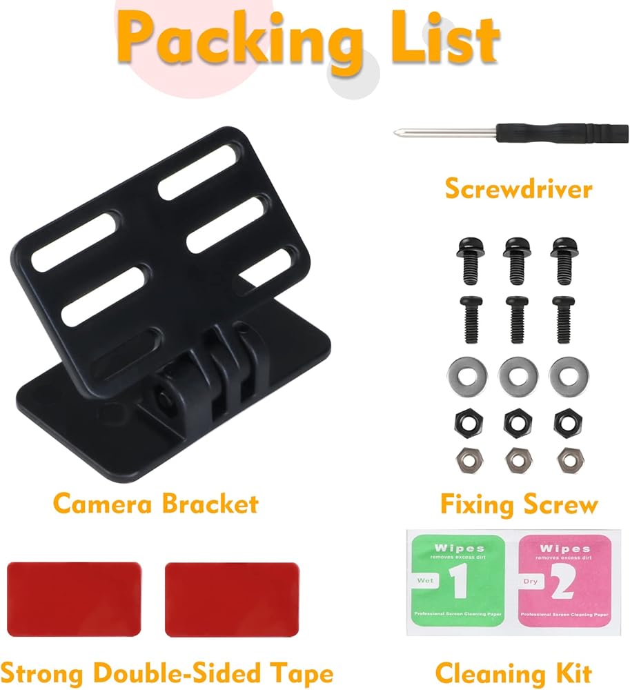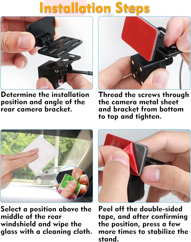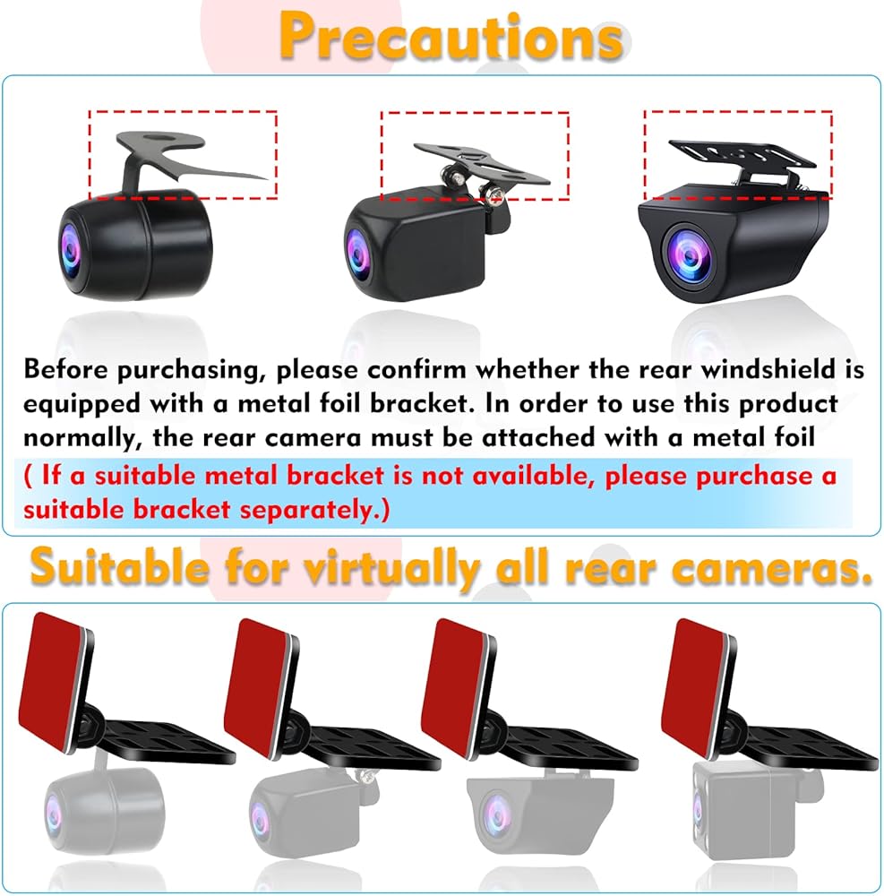 【Warm Tips & Package Contents】Before purchasing, please confirm whether your rear windshield is equipped with a metal foil bracket. In order to use this product properly, the car backup camera must be attached with a metal foil bracket. If a suitable metal bracket is not available, please purchase a suitable bracket separately. Package list: rear camera bracket×1, two sets of fixing screws, one set of installation tools, double-sided tape×2, wet and dry tissue× 1.