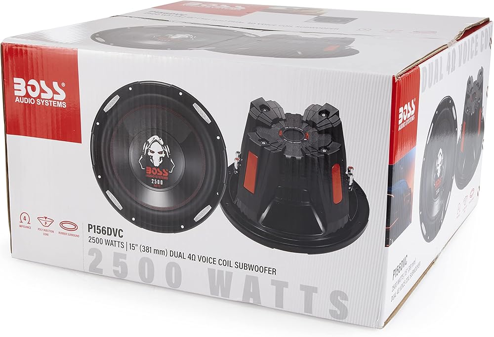 **We are an authorized Boss dealer** The **Boss P156DVC** 15" 2000 Watt Phantom Series Subwoofer can handle 2000 Watts of MAX power and 1000 Watts of RMS power. This Boss P156DVC features a stamped steel basket, a poly-injection cone, a rubber surround, dual voice coils and a mounting depth of 7.34".