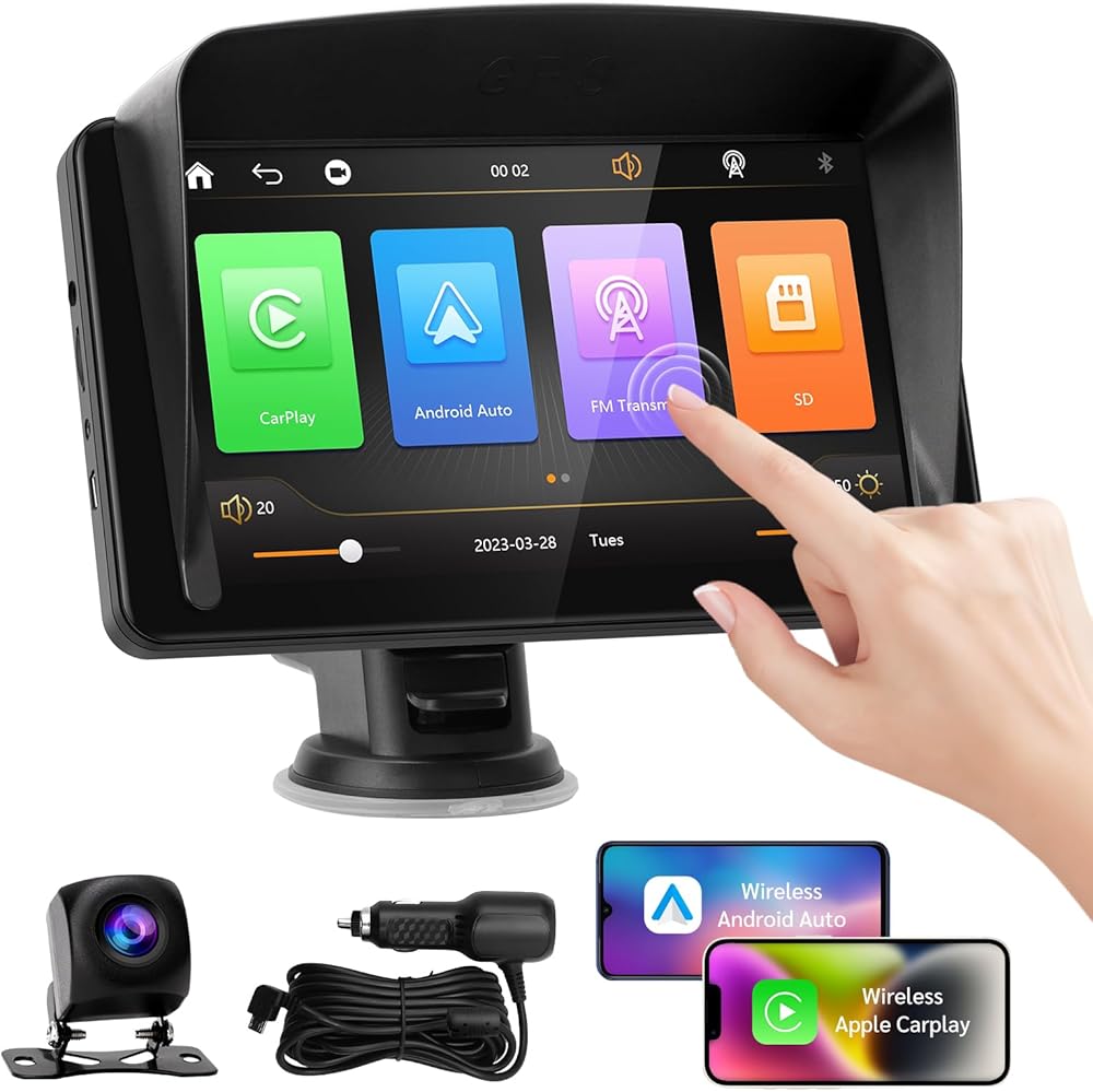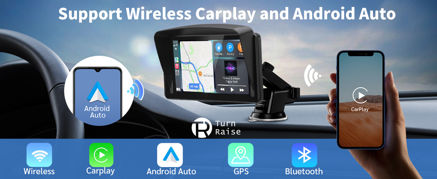 TURN RAISE Portable Apple CarPlay,7" Touch Screen Double Din Stereo Wireless Carplay Car Stereo and Android Auto with Siri/Bluetooth/Maps Navigation/Voice Control/Backup Camera/AUX/FM for All Vehicles