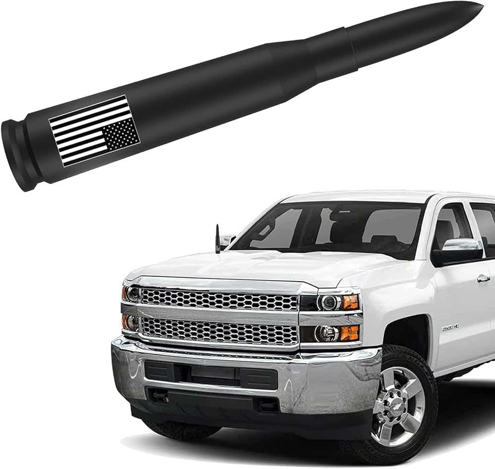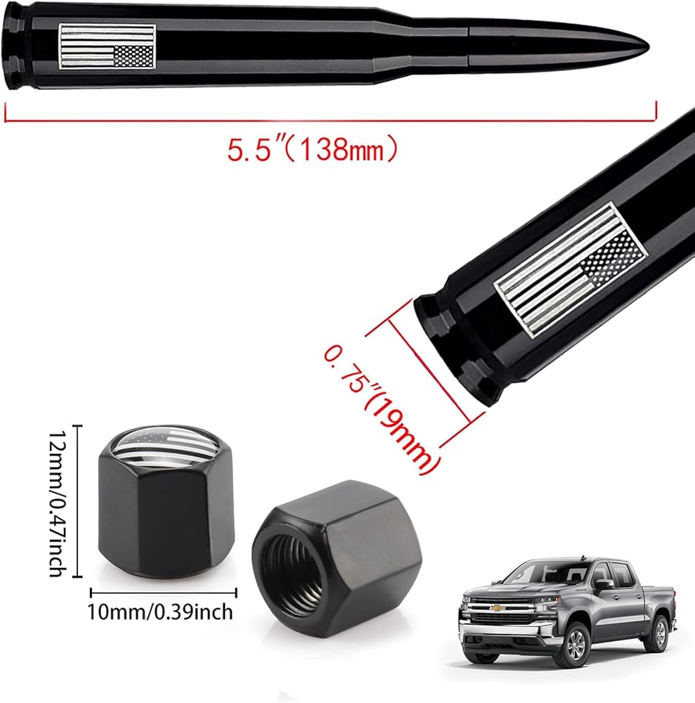 Truck Car Bullet Antenna with Valve Stem Caps Mast for GM Chevy Silverado 1500 2500 3500 HD Ford F150 F250 F350 Denali Heavy Pickup Truck Accessories (Black)-America Flag-Carwash Safe