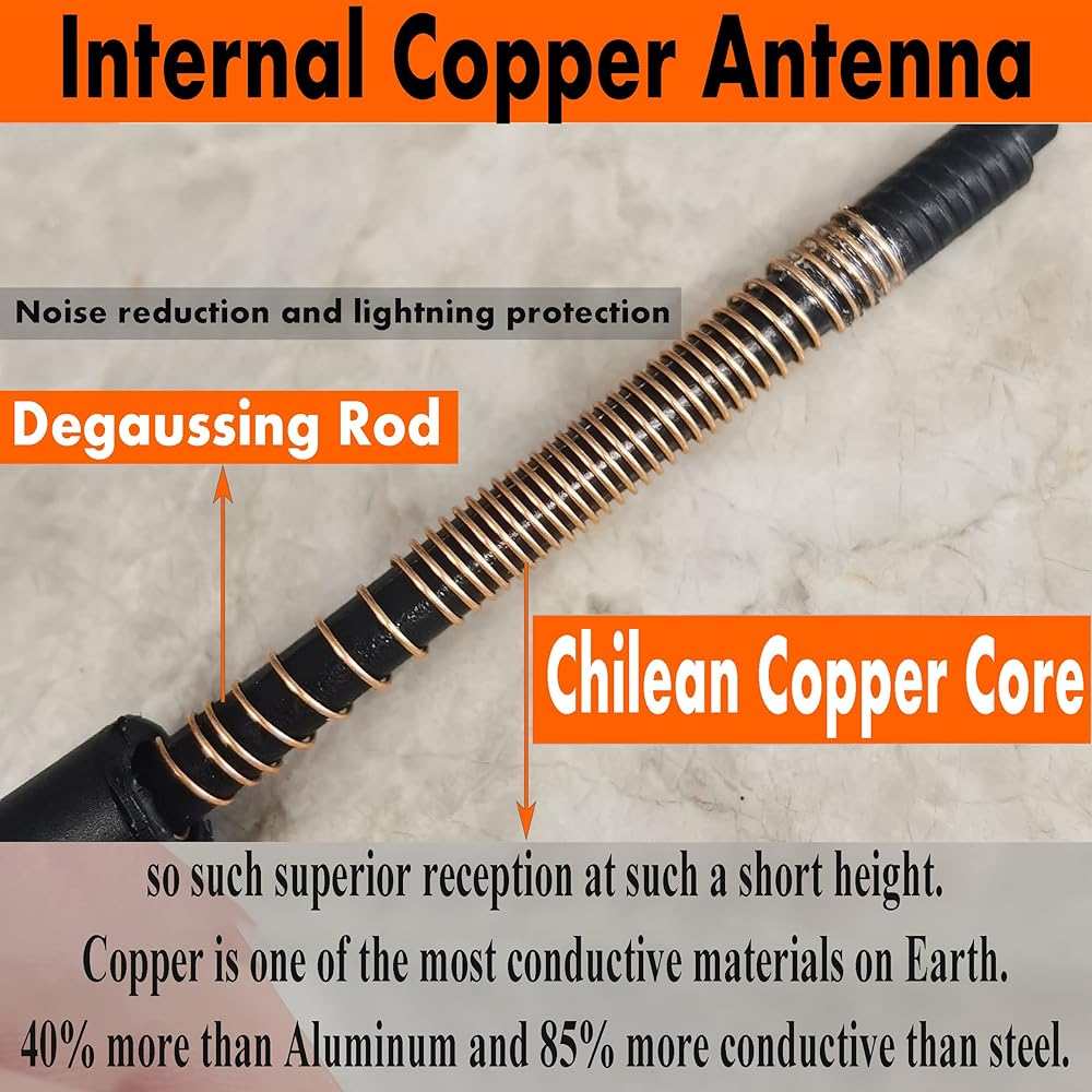 Super AM/FM Reception: The material used to receive the signal inside is made of high-quality copper from Chile, Internal copper coil is 40% more than aluminum, 85% more conductive than steel. Inner fiberglass degaussing rod, noise reduction and lighting protection. Through thousands of experiments, we worked out the preferable structure for short antennas that performs better in reception on either AM or FM bands.