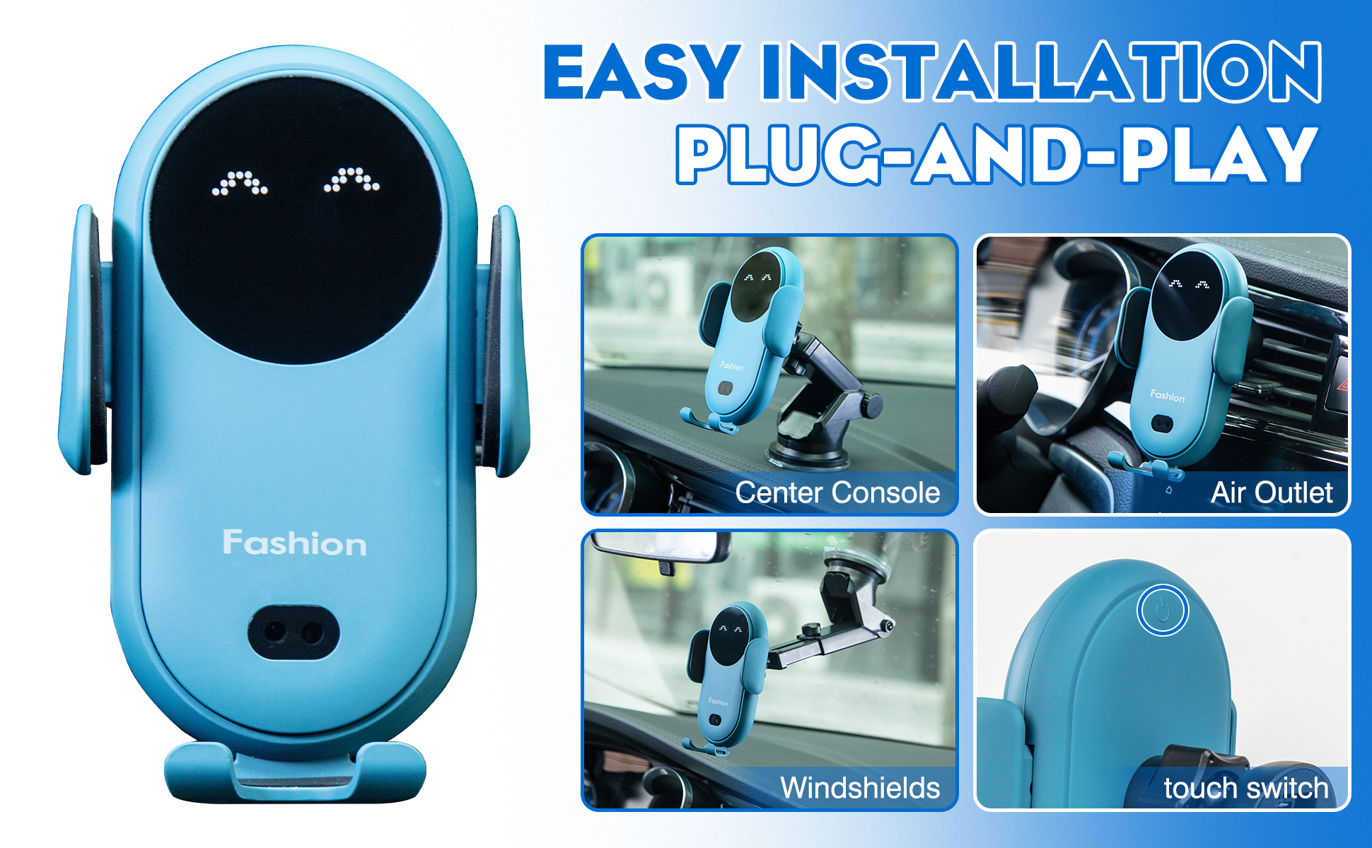 Suction Cup Mount and Socket Bracket:The wireless car charger mount supports two mounting methods, suction cup mount can be directly mounted on the center console or windshield; socket bracket can be mounted on the air conditioning vents, adapted to round, horizontal and vertical air vents. You can choose the way to install the car wireless phone charger according to your own preference.
