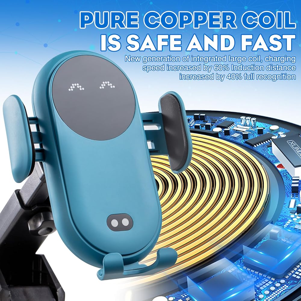 Intelligent Sensing and Automatic Clamping: After the car wireless charger is connected to the power supply,the indicator light is on,when the cell phone is close to the wireless charger 5-20CM,it will automatically open its arms,and after putting the cell phone in,it will automatically clamp the cell phone. To take out the cell phone, you only need to touch the raised induction point on the top of the back shell,wireless car charger can automatically open its arms and take out the cell phone.
