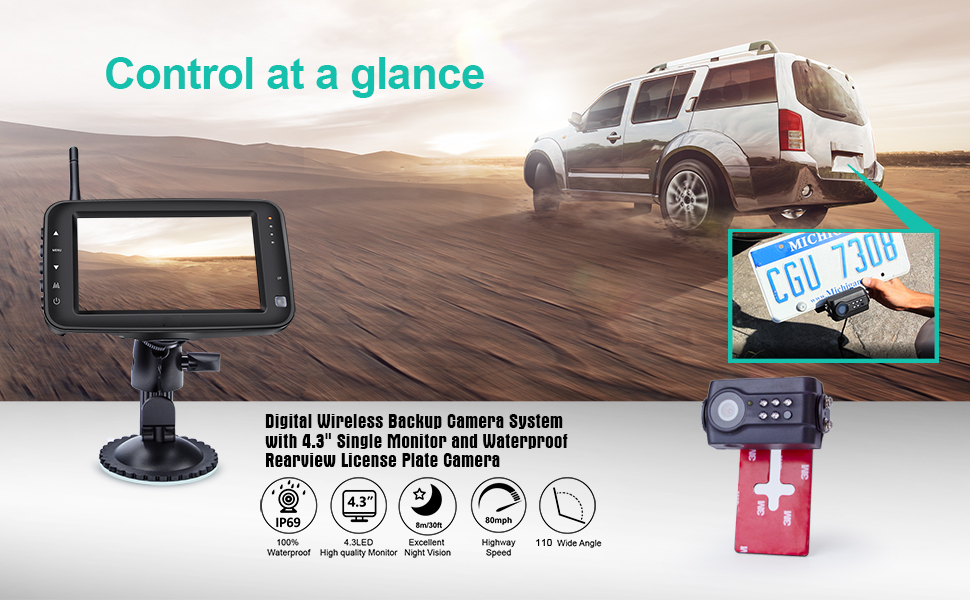 * 〖Easy Installation〗: 4.3'' Wireless LCD monitor with suction cup bracket, built-in wireless receiver module, the guild line can be turned on/off by the button. It won't take you over 2 minutes to install the monitor, as soon as you plugged it to the cigarette lighter, then it works. Camera built-in wireless transmitter module, power connected to reversing light (monitoring when backing up) or ACC (for long time monitoring), What you need is just a screwdriver