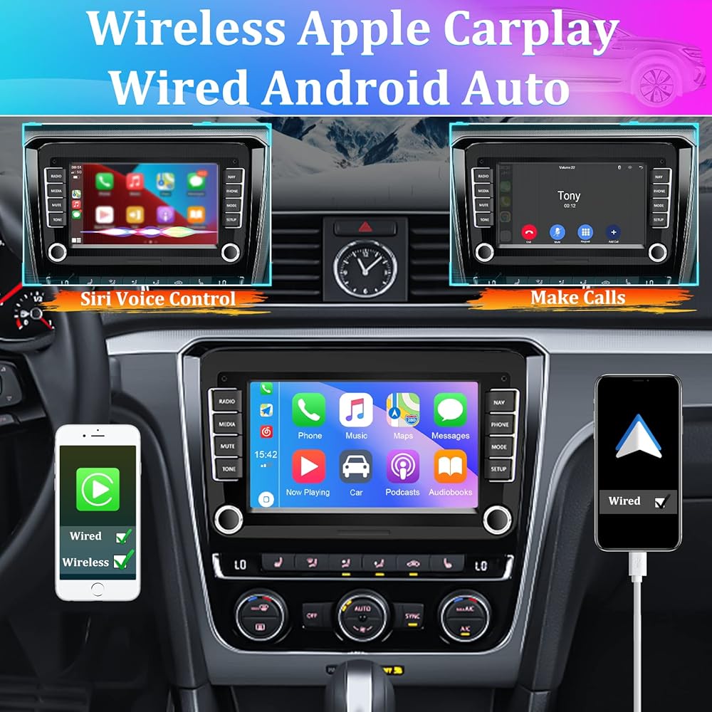 【Apple Carplay Radio with Siri】Wireless Carplay serves to make a connection between your smartphone and car stereo and makes it possible for you to implement Siri and access map navigation, phone contacts, email, notification, music, video... while you stay focused on the road.