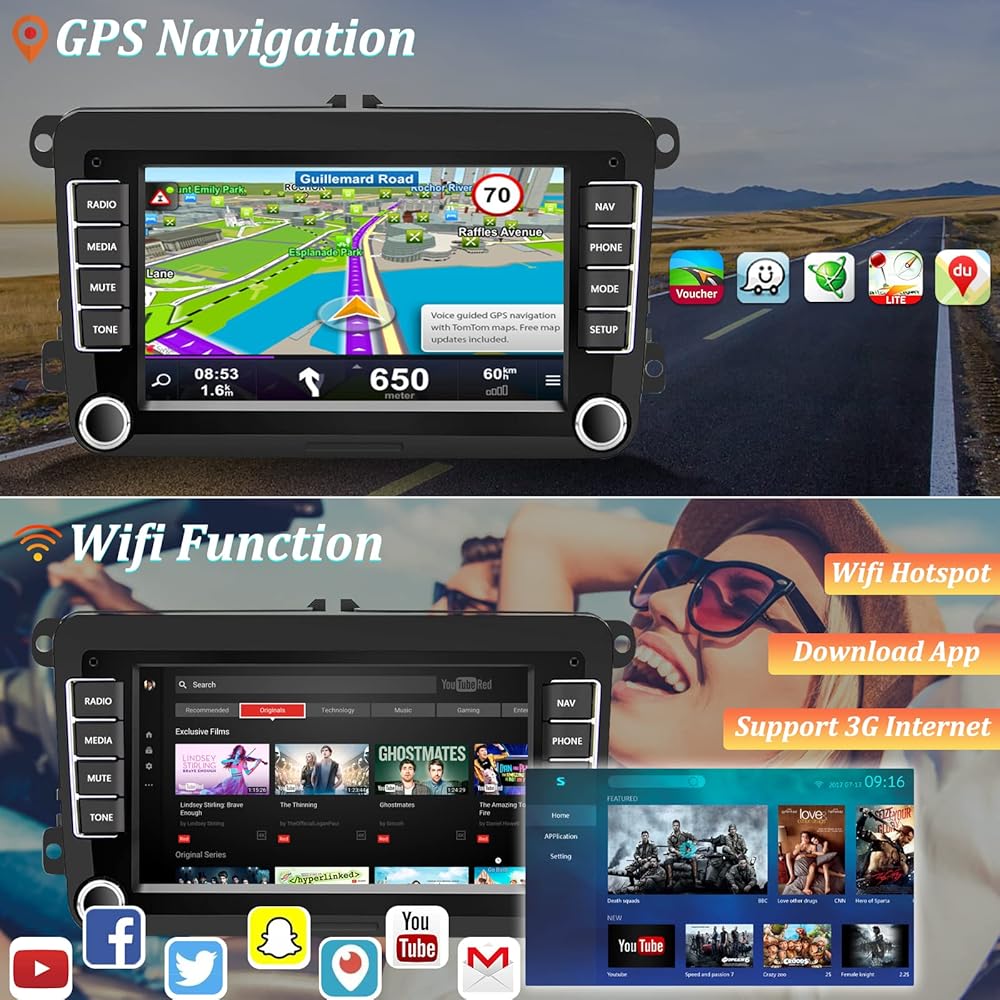 【In Dash Wifi and GPS Navigation】With wifi connection, you can install more applications like Waze, Sygic, Soptify, Pandora, Facebook, Twitter, Youtube etc. Kit with a GPS antenna, you still can use offline map without Internet.