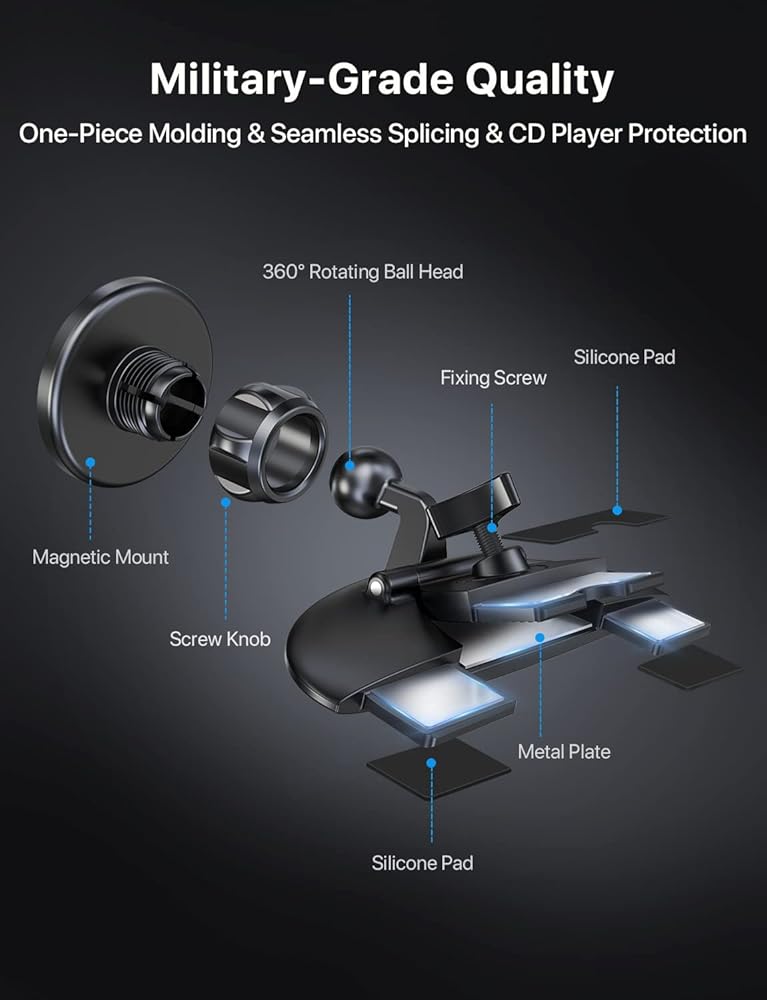 👍【Upgrade Military-Grade 2 in 1 Car Mount】- This cd player phone mount built-in sturdy metal steel, extra add softer and thicker non-slip silicone, the unique installation method forms a triangular stable point, which is non-slip and never falls off. Air vent mount adopts a metal hook design never breaks, upgraded grooves, and hooks firmly to the vents never fall off, the soft silicone on the vent phone mount for car protects your car vents from being scratched or deforming