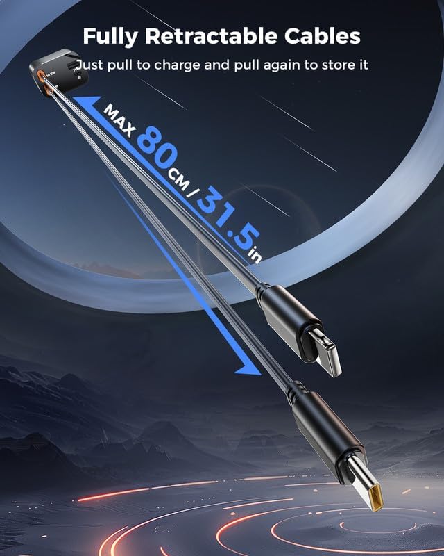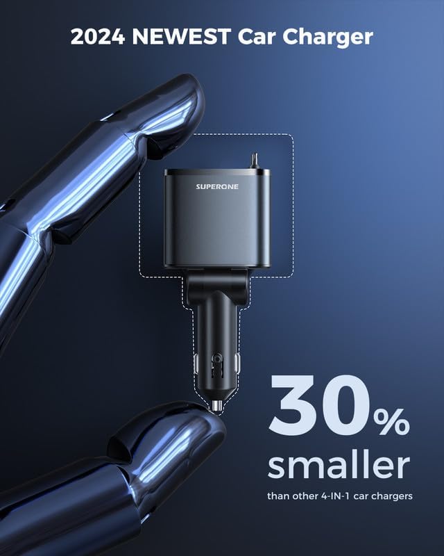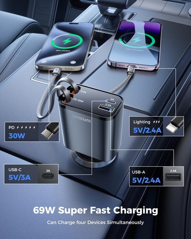 SUPERONE Smaller 69W Retractable Car Charger 4 in 1 Fast Car Phone Charger Adapter with Retractable Type C & L Cords, USB C Car Chargers for iPhone 17 16 15 14 13 12 Galaxy Pixel