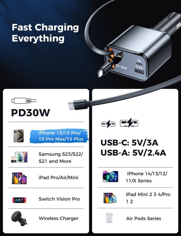 💌Universal Compatibility: The car charger adapter is suitable for iPhone 15/14/13/12/11/10/XR/XS series, iPad Pro/Air, Samsung Galaxy S23 S22 S21+ S20 S10 Note 20/10 A52 A71 A51 A10E S9 S9 Google Pixel 6 pro/6/5/Moto/LG, sports Watches, dash cams, cameras, and other USB powered devices.