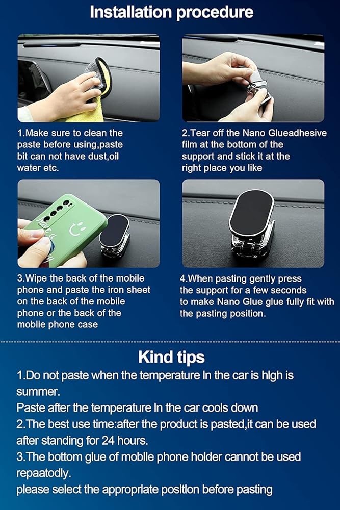 [Multi-functional Magnetic Phone Mount] This magnetic phone holder for car is used for the dashboard, instrument panel, back of the screen, desktop and other applicable areas.There are heat resistant metal mount for your car, so don't miss it!