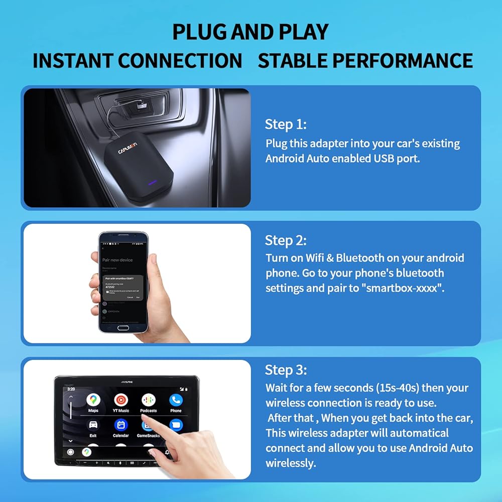 ▶▶【 PLUG AND PLAY & AUTO CONNECTION 】: We make the initial setup simple for a fast and easy connection. Just plug this wireless AA adapter into the head unit USB port of your car. Turn on “WIFI & BLUETOOTH” on your phone and go to the ‘Bluetooth' setting and pair with the device name “SmartBox-xxxx”. After that, This AA adapter will automatic connect and allow you to use Android Auto wirelessly when you get back into the car everytime.