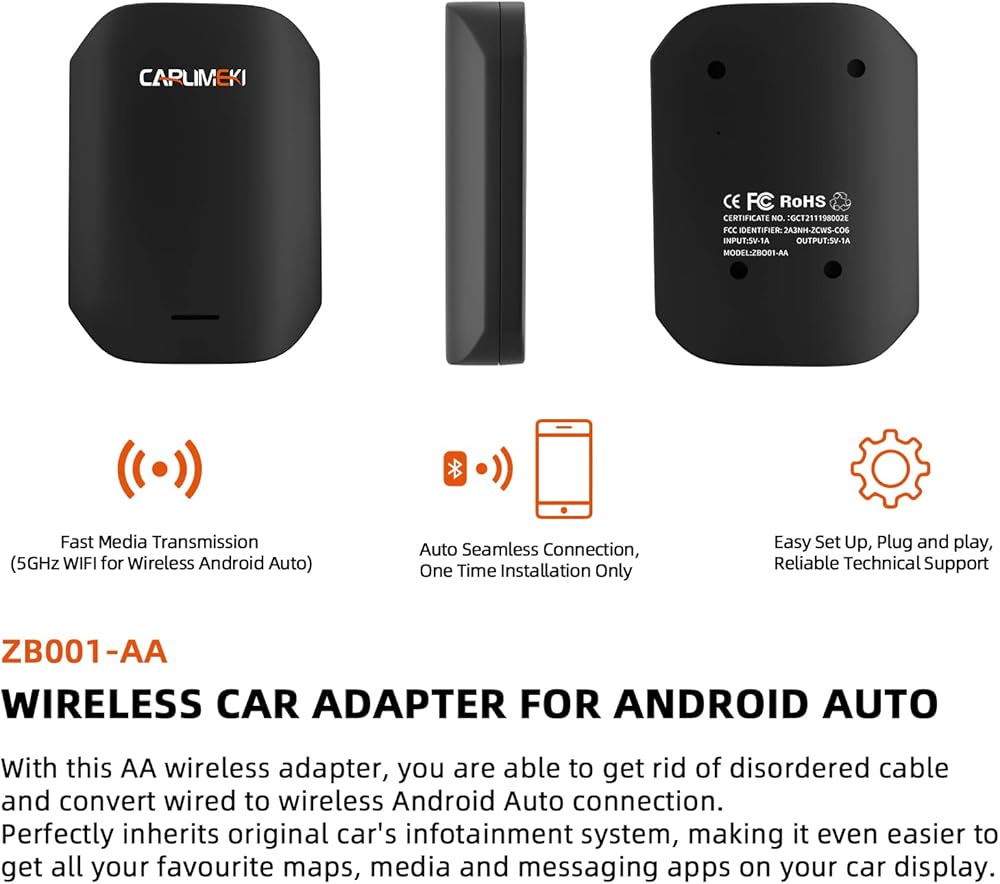 ▶▶【 WIRELESS CAR ADAPTER FOR ANDROID AUTO 】: Android Auto is a simpler, safer way to use your phone in the car. With this AA wireless adapter, You are able to get rid of disordered cable and convert wired to wireless Android Auto. Equipped with a 5GHz module, our wireless dongle will help you to have instant connection and stable performance to connect to Android Auto on your car display. The high-end configuration makes connection stable enough without disconnection easy and lag when using.