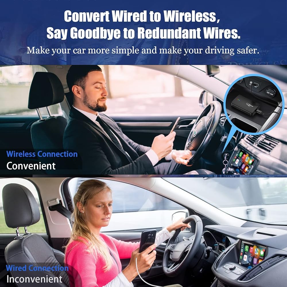 [ Leave Your Phone in Your Pocket ] - This apple carplay wireless adapter allows your phone to wirelessly connect to CarPlay, it completely reduces the damage to your phone from frequent plugging and unplugging of the charging cable, and you don't have to worry about accidentally leaving your phone in the car when you finish a drive. Moreover, is so small that it can be easily hidden or installed out of the way which make your car more cleaner and tidy.