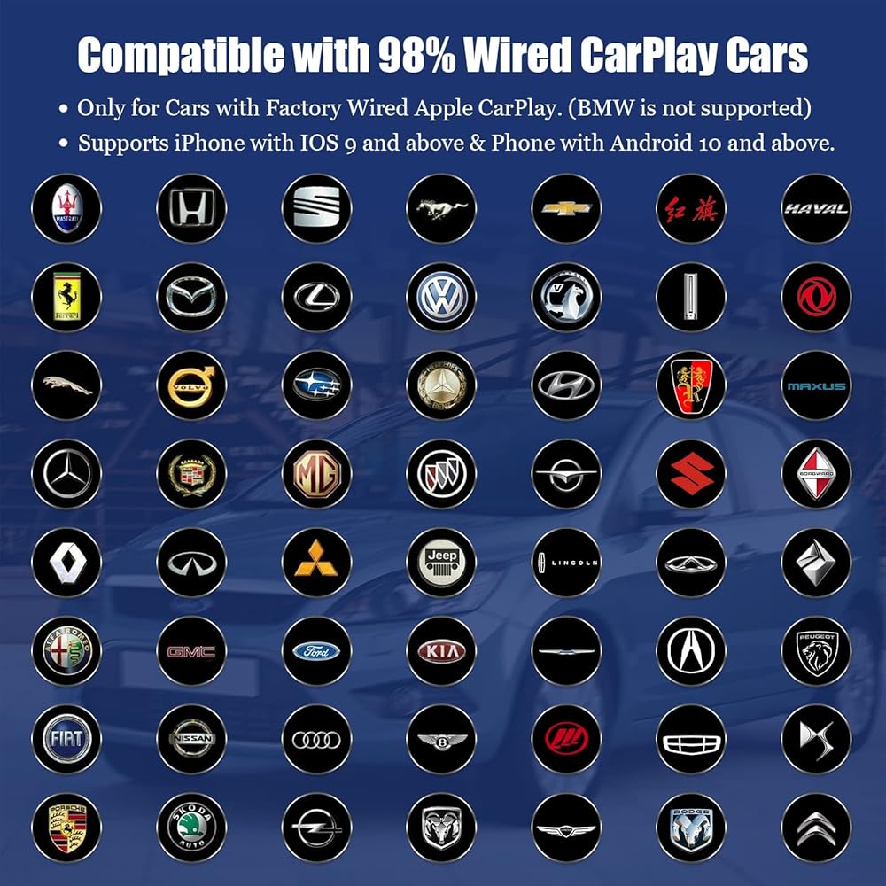[ 2022 New Version Multifunctional Carplay Wireless Adapter ] - This magic box carplay wireless adapter for iphone with IOS 9 and above and for phones with Android 10 and above is compatible with all cars with Apple Carplay with a wired connection, over 600 car models, supports both Apple Carplay and Android Auto, fits almost 95% of cars with on the market, which greatly saves you time distinguishing which products to buy. (Not for cars with built-in wireless carplay connectivity, such as BMW.)