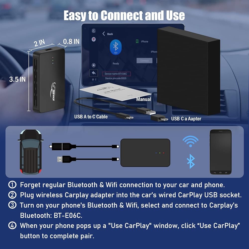 [ Auto Connection and Truly Plug and Play ]- After first setup, this apple carplay adpater with auto-connect will work right out of the box and pair your car and phone in seconds. You just plug it into the same jack you normally use to connect your phone to Carplay. Sync bluetooth connection. (Let your phone forget the regular bluetooth/Wifi connection to the car before starting)