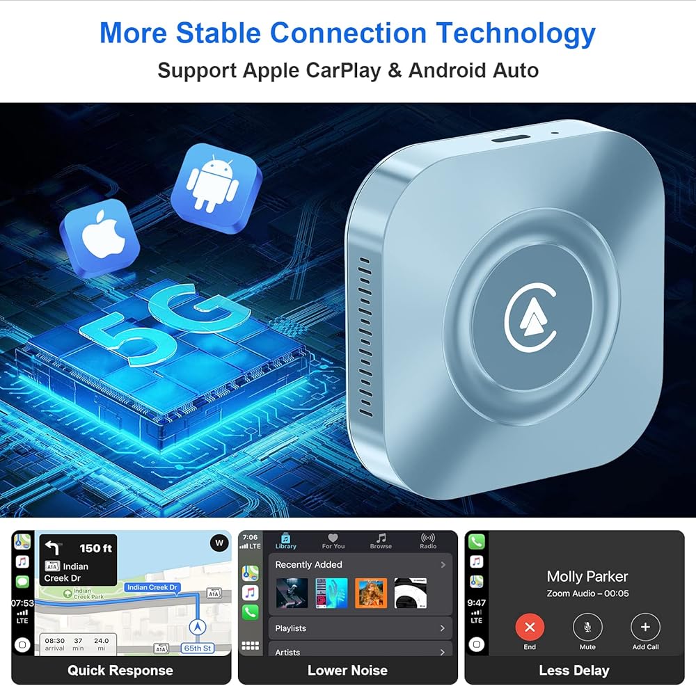 🚔 Powerful 5G Stable Connection to Reduce Latency - 2.0 magic box carplay wireless adapter have built-in 4-core newly upgraded smart IC chips, adopts the latest 5G and 2.4G dual-band signal filtering technology, which enhances the Wifi signal, reduce the delay during calls, reduce noise when playing music, and fast response during navigating with real-time GPS. You don't even notice any difference from wired mode!