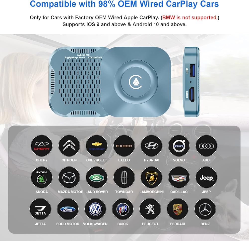 🚔 Compatible with Most Wired Carplay Cars - KAMING apple carplay android auto wireless adapter works with all cars that have factory-installed Wired CarPlay system. The carplay box support iPhones with IOS 9 and above, Phones with Android 10 and above. If your car has wired carplay and your phone is iPhone, Samsung, Xiaomi, Oppo, Vivo, etc., there is no need to hesitate!