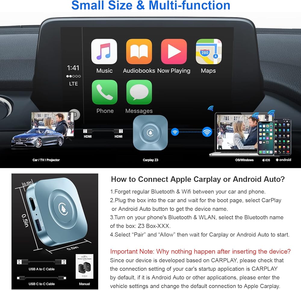 🚔 Tips You Should Know - Be sure that your car has factory wired CarPlay, whether you're going to to use apple carplay or andoid auto. It compatible with over 600 models, but it has not been tested on all car models, if it does not work with your car, just consult our 24 hours stand-by service to get help if there are any problems/issues. Package includes: 1 * CarPlay Adapyer, 1* USB-A to USB C able, 1 * USB-C to USB-C. Just buy and enjoy our products and customer service with confidence.