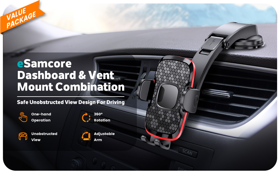 Safe Unobstructed View Phone Mount: Are you still using large and view blocking car phone holder on your dashboard or windshield? eSamcore phone holder for car uses downward extending mount arm, which will not block your view of the road. It is much safer than the old big car phone holder mount on the dashboard.