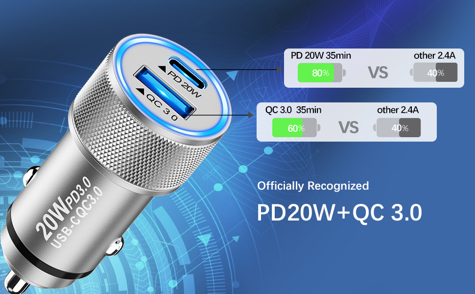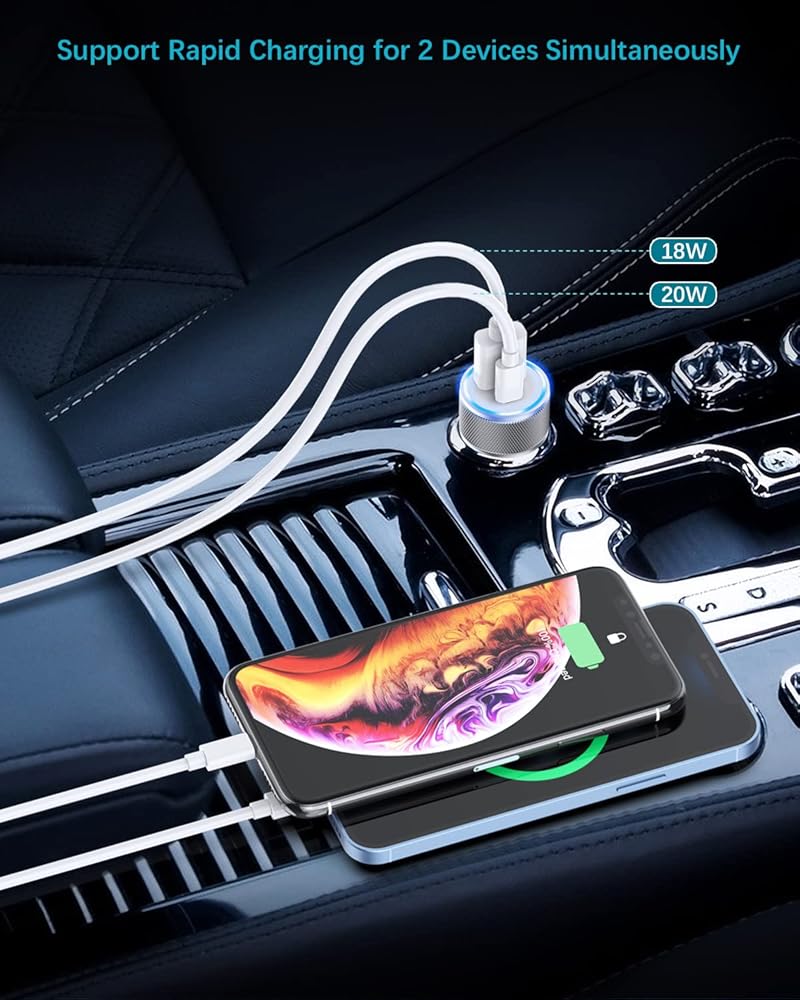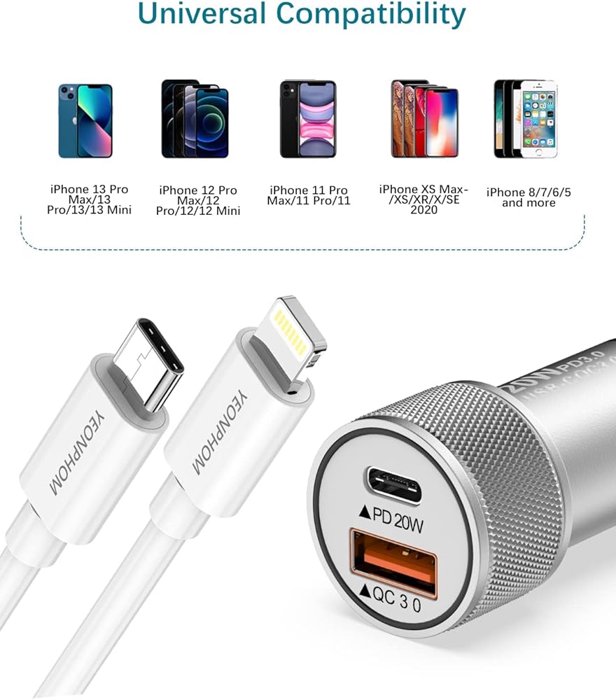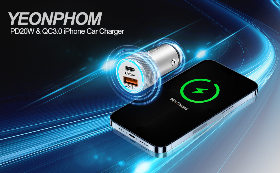 【Charger Two Devices Simultaneously】: Equipped with USB A(QC3.0) port and USB C(PD3.0) port, YEONPHOM cigarette lighter usb charger can charge two devices simultaneously. This fast charging speeds up to 20W for power delivery port. 3X FASTER charging speed compared with 5V/1A which can fast charge iPhone 14/iPhone 14 Plus/ iPhone 14 Pro/iPhone 14 Pro Max /13/13 Mini/13 Pro/13 Pro Max/12/12 Mini/12 Pro/12 Pro Max/11/Pro/Max/iPhone X/XS/XR/8/8 Plus/SE. Quick Charge 3.0 port, charges most iPhone devices from 0% to 80% within 35 minutes.