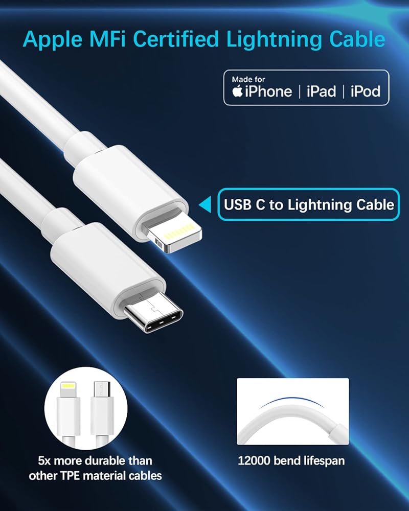 【Apple MFi Certified Lightning to USB C Cable】: Our iPhone fast car charger comes with a 3.3ft long USB C to lightning cable,can withstand 12,000+ bend lifespan test, which is more durable than other TPE material cables, built-in original MFi chip ensures completely flawless compatibility with Apple devices, automatically match the current required by devices and fast charge your iPhone/iPad/iPod devices without trigger warning messages.