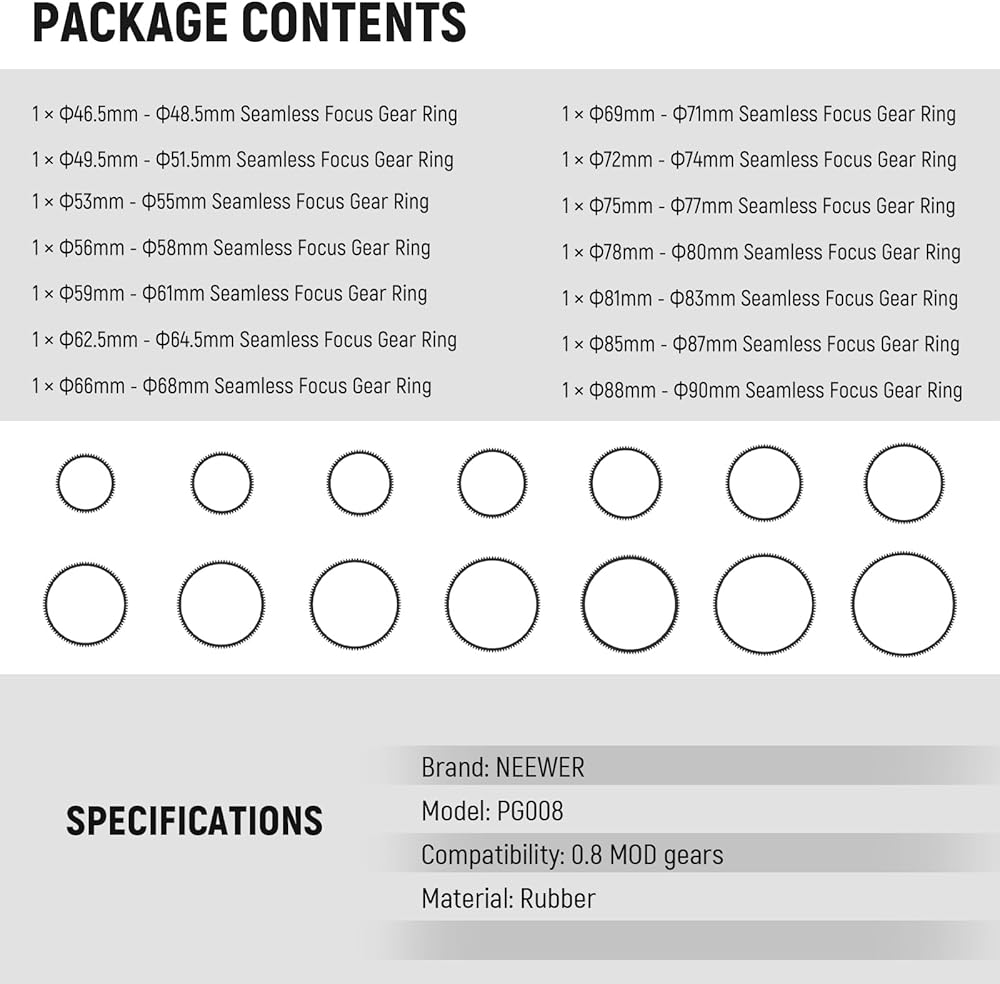 【Universal Compatibility】 14PCS focus gear rings match lenses of various camera lens diameters: ø46.5-48.5mm, ø49.5-51.5mm, ø53-55mm, ø56-58mm, ø59-61mm, ø62.5-64.5mm, ø66-68mm, ø69-71mm, ø72-74mm, ø75-77mm, ø78-80mm, ø81-83mm, ø85-87mm, ø88-90mm