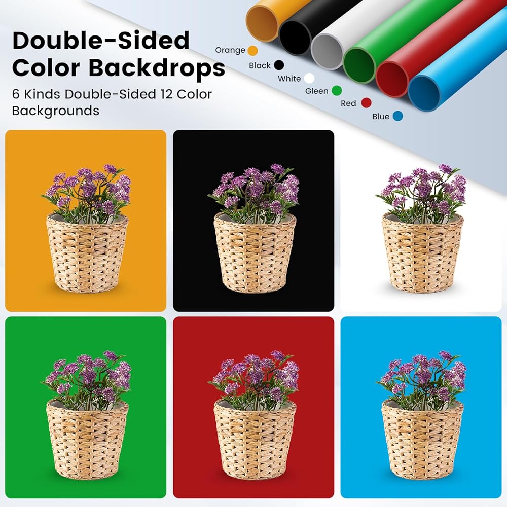 Colorful Backgrounds: Comes with 6 sturdy, wrinkle-free, double-sided color backgrounds, giving you endless possibilities for creative and professional-looking photos.