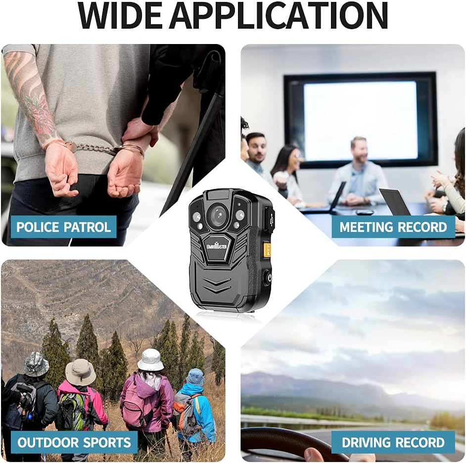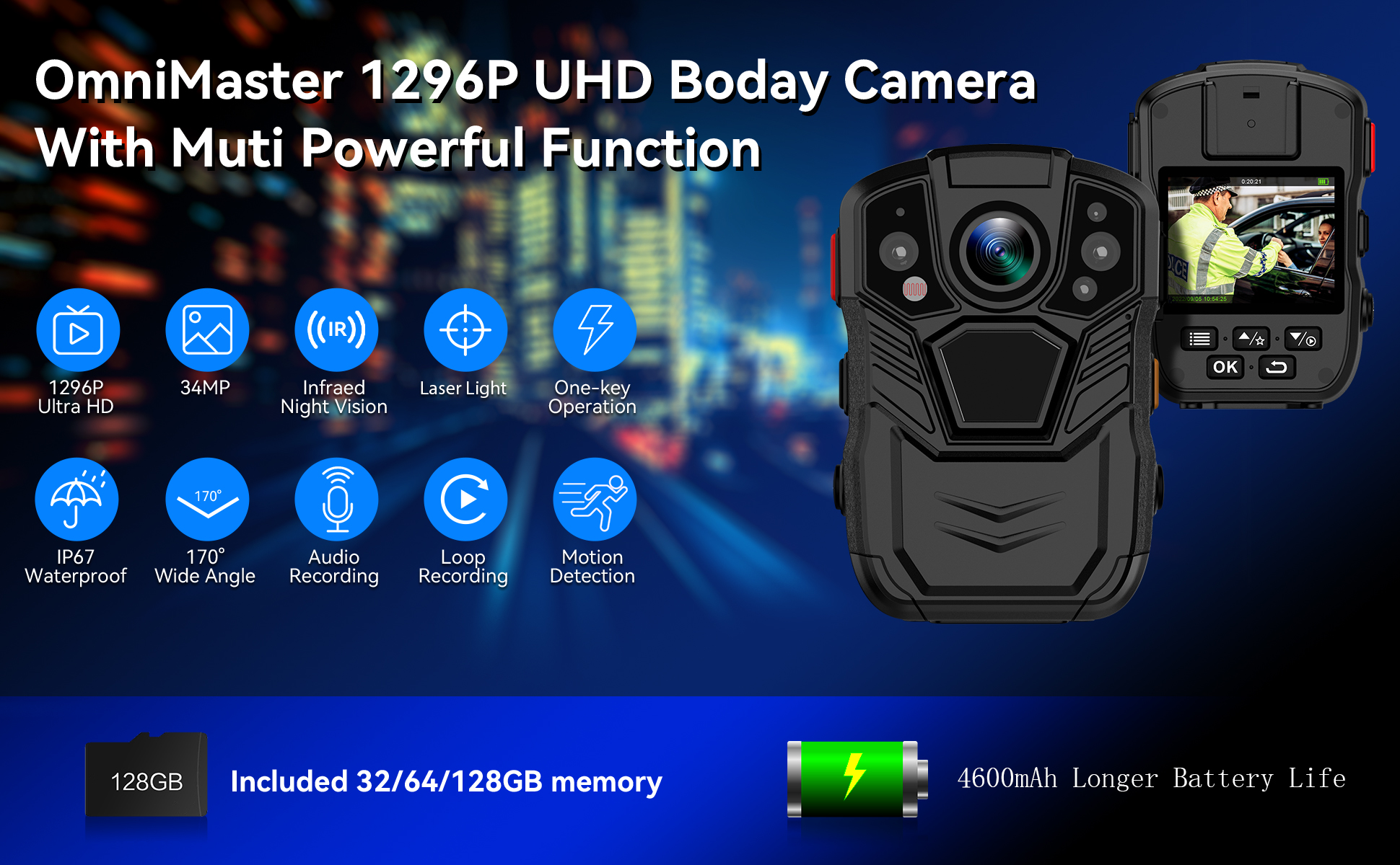 [NIGHT VISION & ULTRA WIDE ANGLE]: With high-itensity infrared LEDs, OmniMaster body worn camera can capture clear footage with face detection up to 33 feet Away in super low light. With the 170° ultra wide angle, it can capture much more information for the critical scene near by.