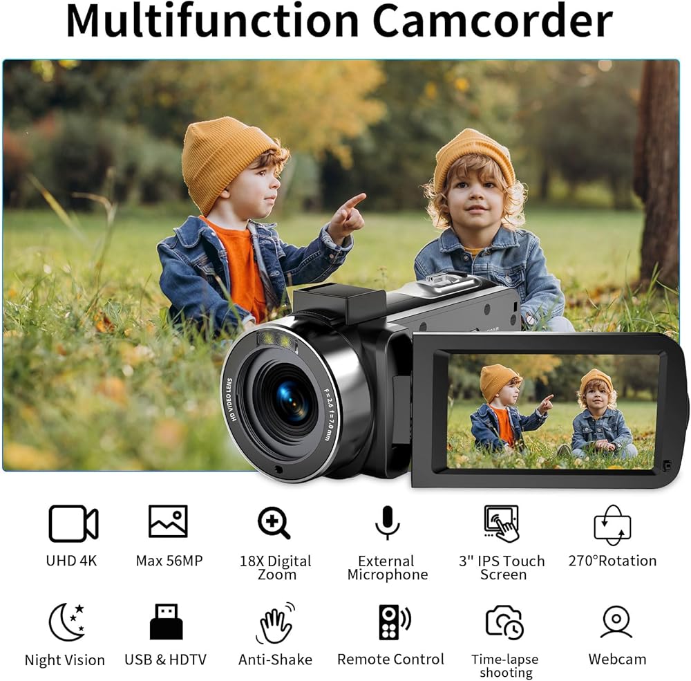 4K 56MP Video Camera Camcorder, 18X Digital Zoom 270°Rotation 3.0" IPS Touch Screen Handheld Digital Camcorder, Remote Control IR Night Vision Vlogging Camera for YouTube