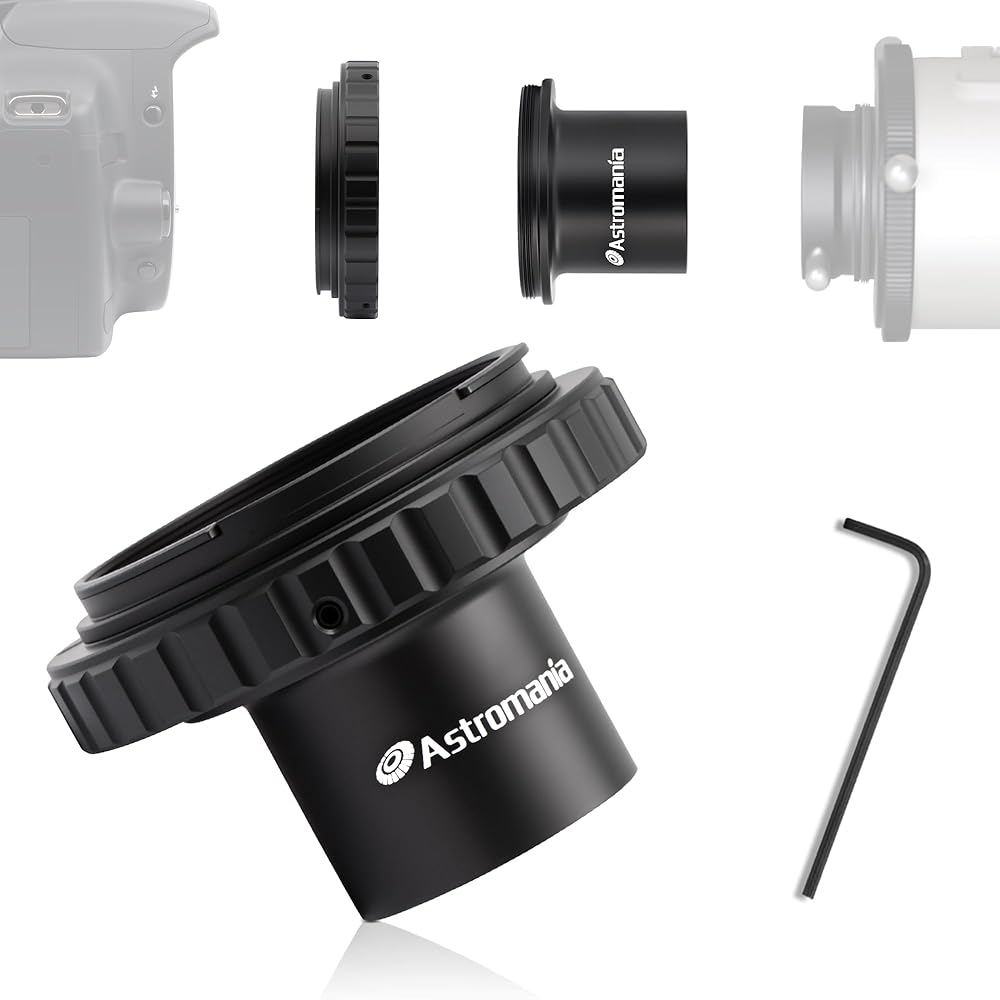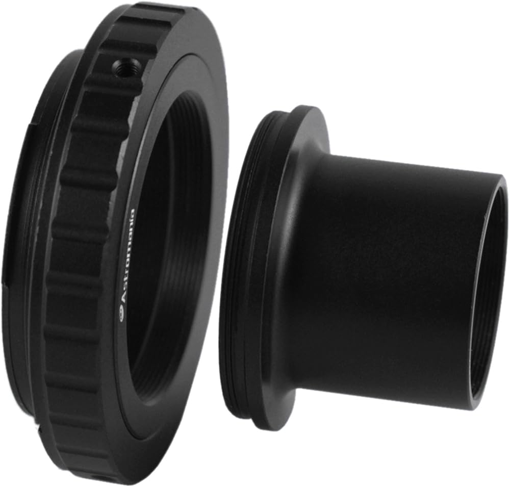 This set contains a T-ring for Ca non EOS Cameras and a 1.25" to M42 T-mount. They are made of high-quality material, durable for long time use. It fits almost all Camera EOS 5d, 5d Mark Ii, 50d, 60d, 20d, 30d, 40d, 350d, 400d, 450d, 500d, 550d, 600d, 1100d, 1d, 1d Mkiii, Digital Rebel T4i, T3i, T2i, T1i, Xt, Xti, Xsi, Xs, and All EOS SLR Camera. It is very easy to use: 1. Connect the T-ring mount and T-Mount by M42 threads. 2. Assemble the set to your camera. 3. Connect the camera with the set to the telescope by 1.25" (31.7mm) excircle on T-mount. Tighten the screws on the 1.25" adapter. Make sure they are locked and safe. 4. Put on the camera and calibrate focal length te get a clear image. Package Include: 1 * T-ring for Ca non EOS SLR/DSLR ; 1 * 1.25"-M42 T-mount