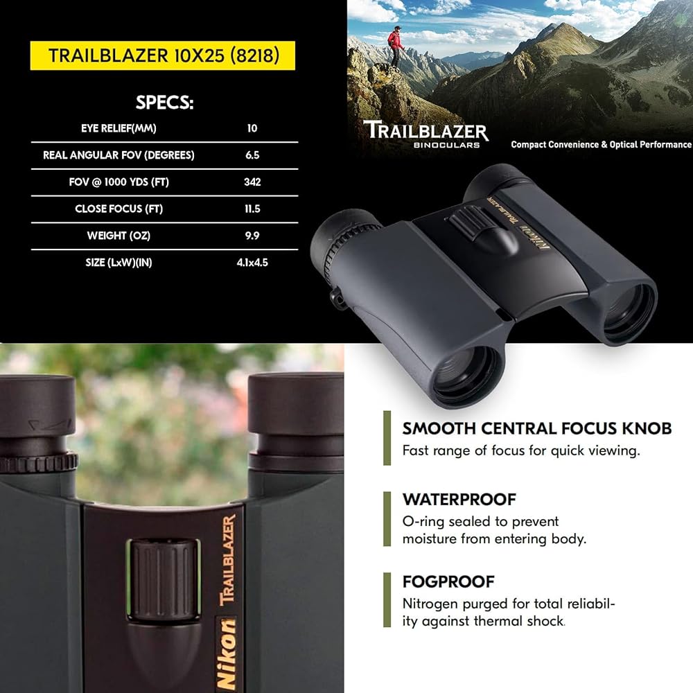 Compact and lightweight, the Nikon 8x25 Trailblazer ATB Binocular is an ideal companion for watching birds and wildlife on the trail, your favorite team at the stadium, or just sightseeing around town.