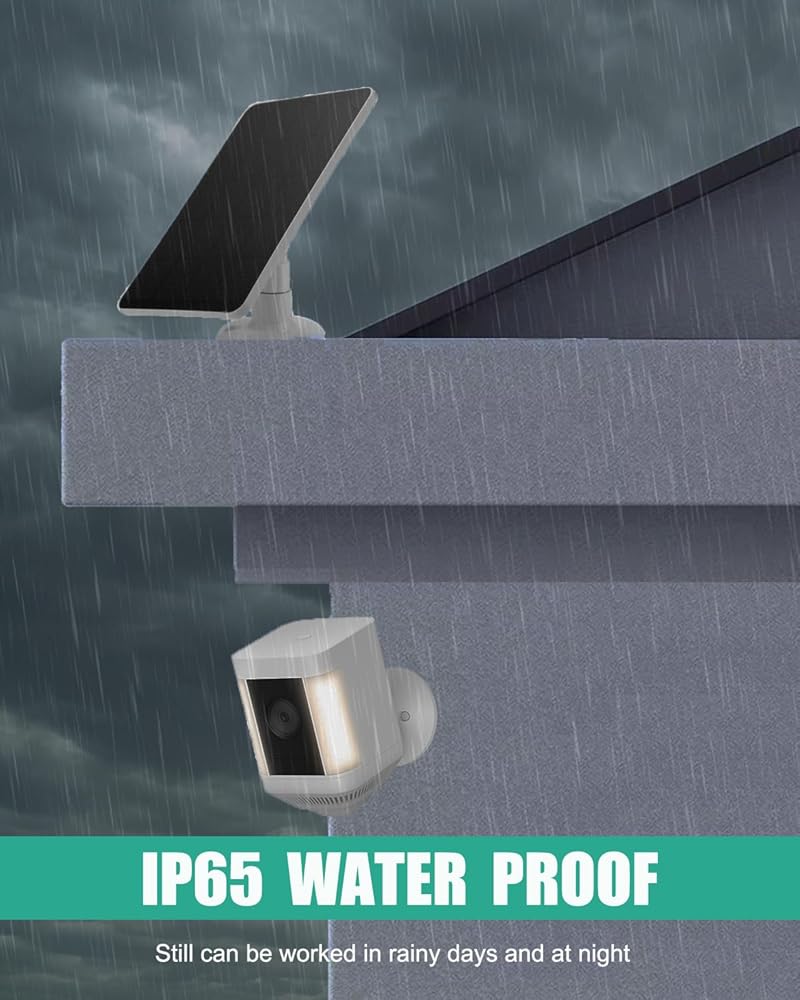 [Waterproof and Dustproof]Ring camera solar panel outdoorl with an IP65 rating, it is designed to be waterproof and dustproof, using durable and long-lasting materials. ring solar is resistant to damage and can withstand various harsh environments, providing a stable power output even in extreme weather conditions.