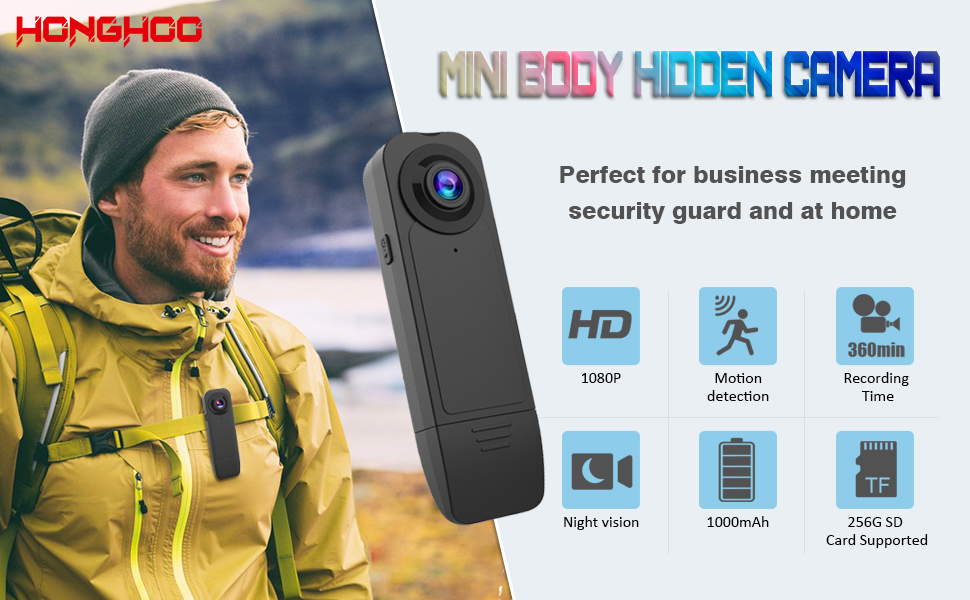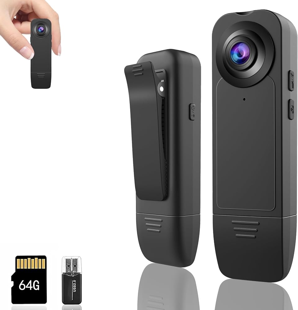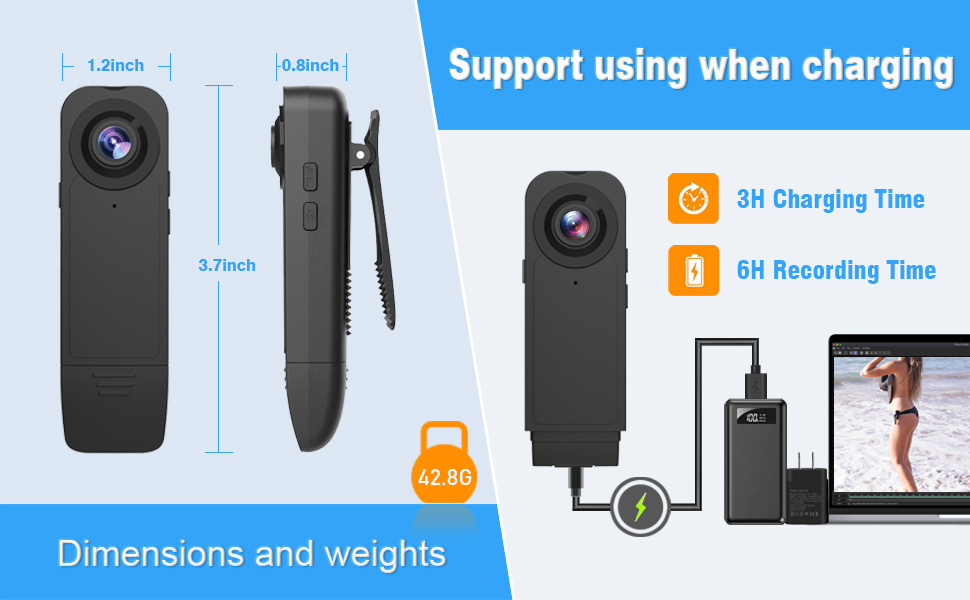 ★【Small Size & Easy to use】Mini body camera It is lightweight with 42.8g only, and 3.7x1.2x0.8inches. Body camera has three buttons, one for switches, one for videos/snapshots. The back clip is designed to be easily clipped in the pocket/collar/portable
