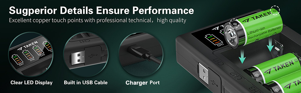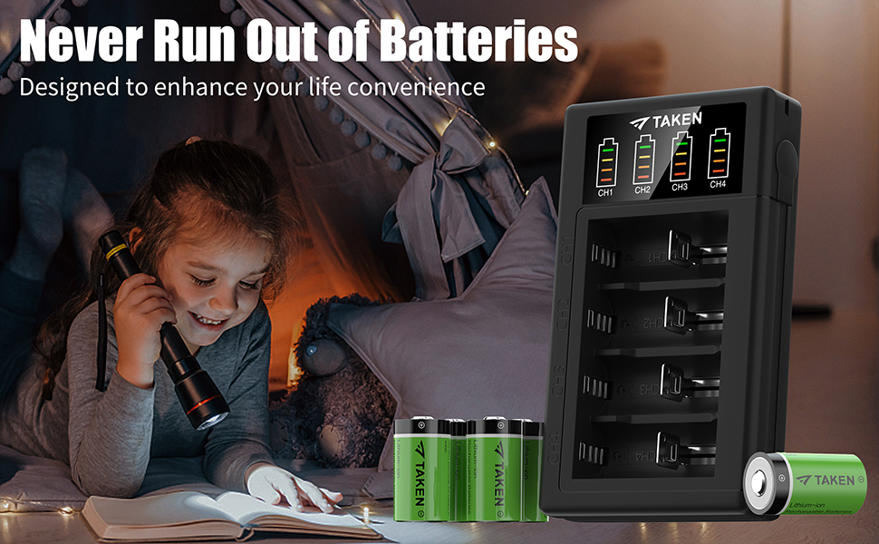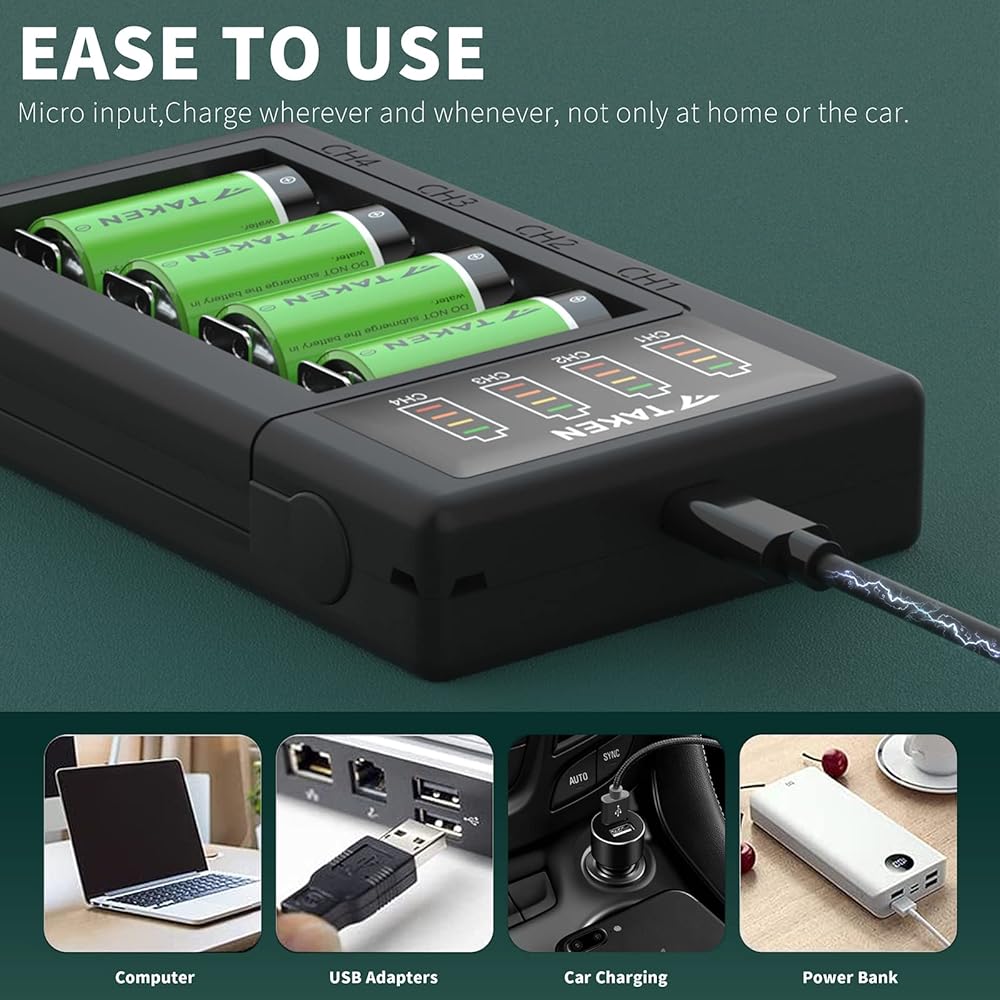قنوات شحن مستقلة مع مؤشرات - يمكن للشاحن ذو 4 فتحات شحن 4 بطاريات في المرة الواحدة، كل واحدة من البطاريات الأربع تراقب وتشحن بشكل مستقل. يأتي شاحن البطارية مع ضوء مؤشر LED. أحمر عند الشحن وأخضر عند اكتمال الشحن.