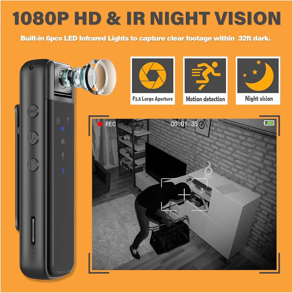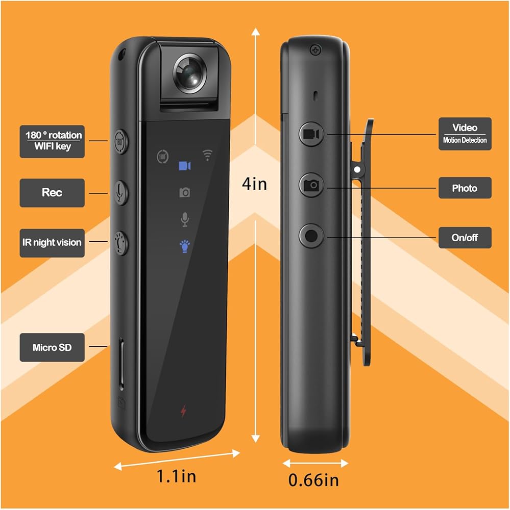 ✅【1920x1080P & Day and Night Mini Body Camera】Lightweight & Compact Mini body camera FHD Videos, providing more high-quality visual details during day and night ( 8ft ir distrance ). The clip design 180 degree lens rotation is convenient for attaching to cloth and other objects.