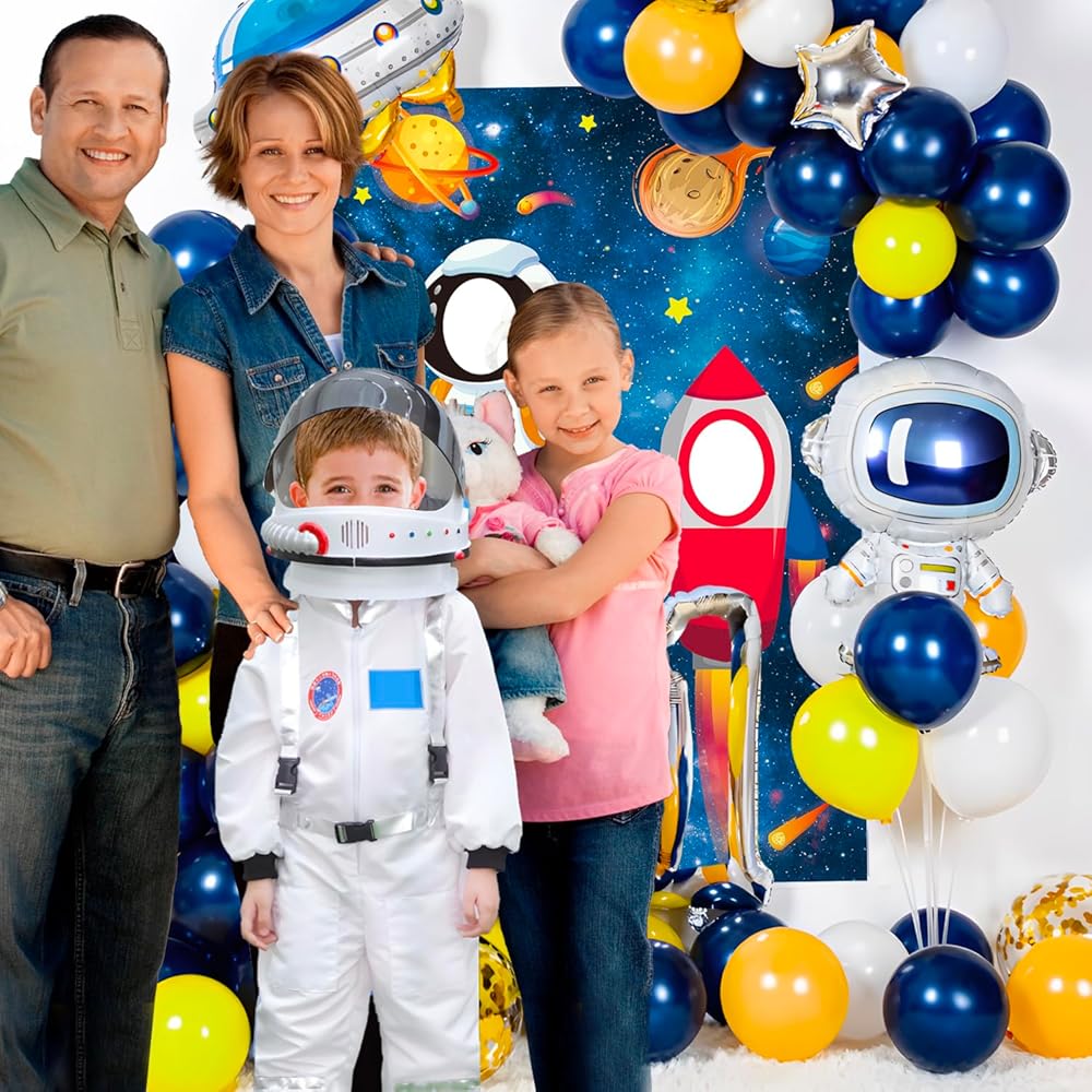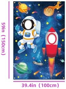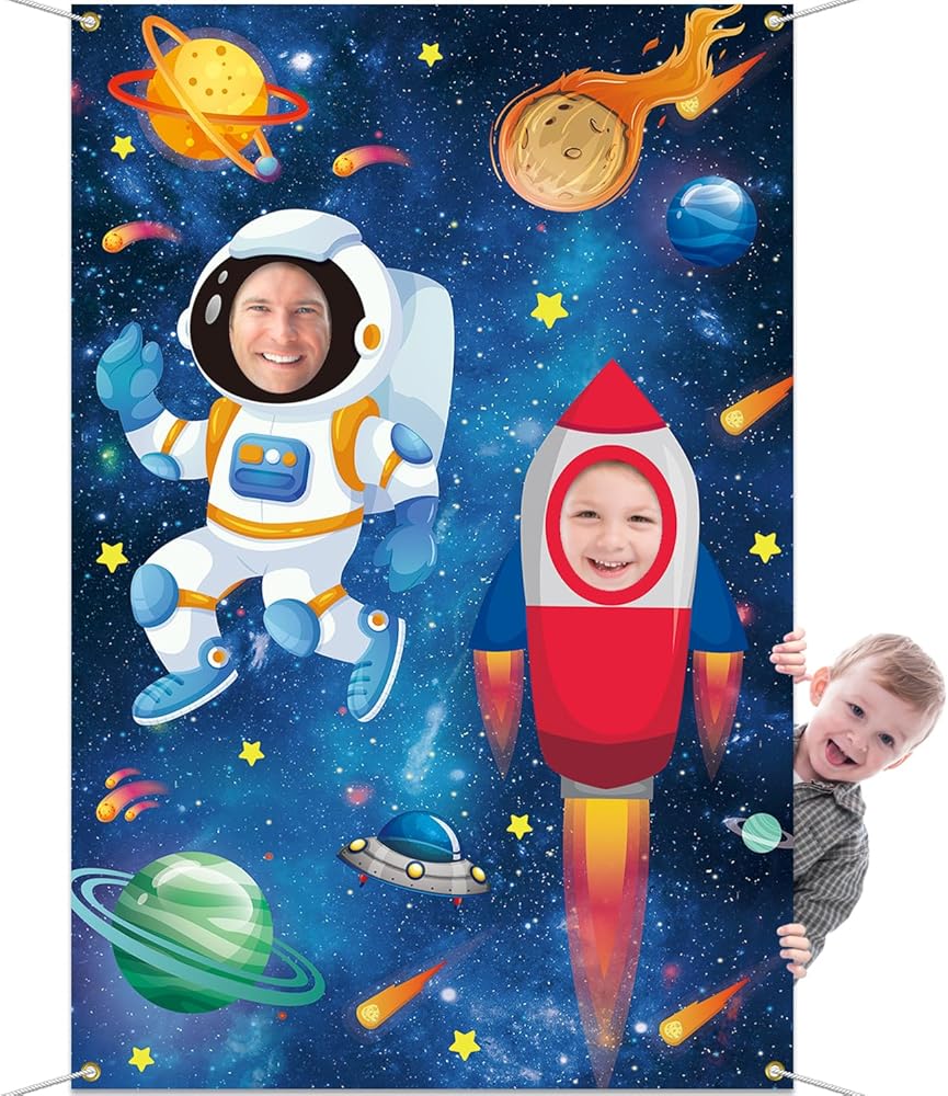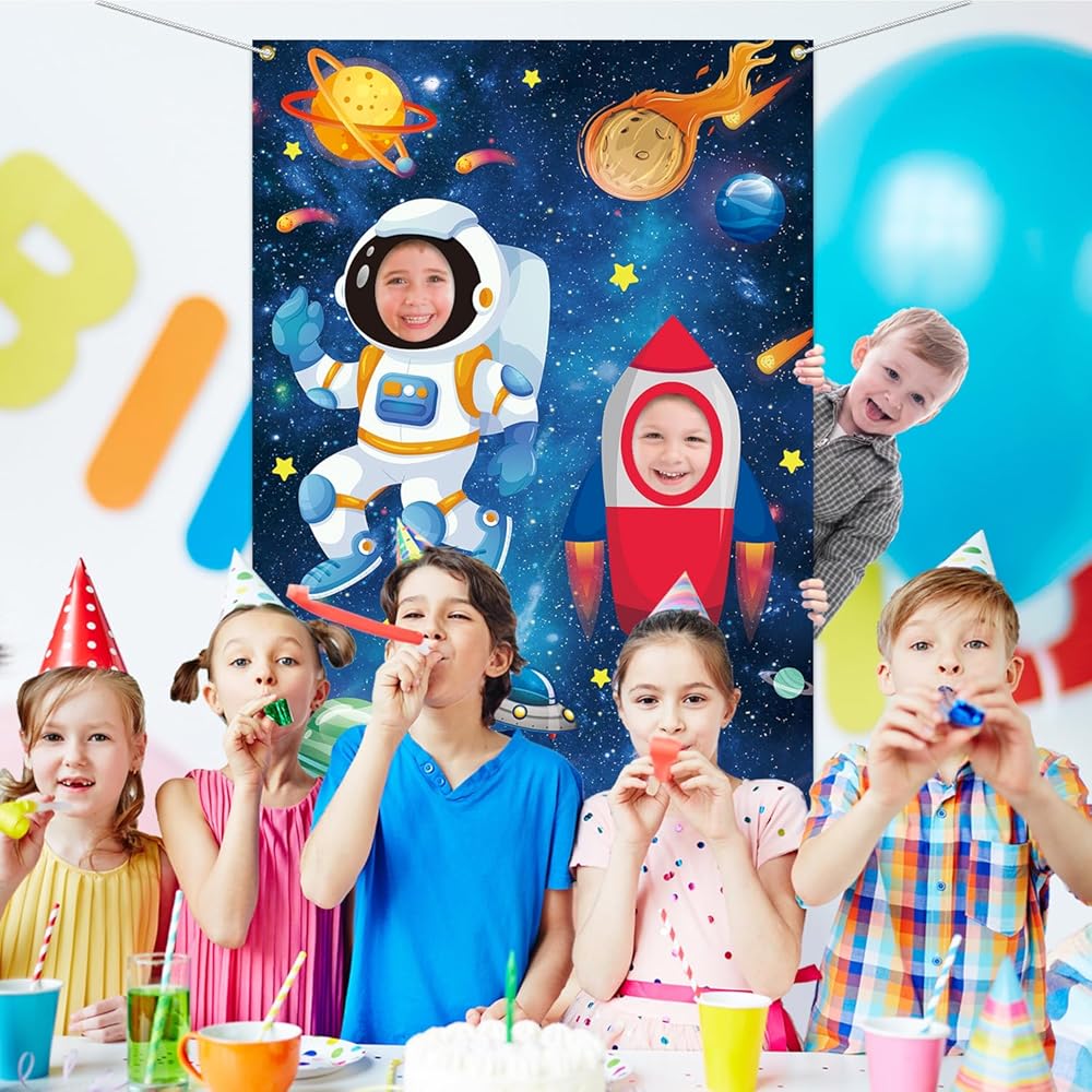 Outer Space Backdrop Banner Decorations Photography Astronaut Face Photo Props Planet Meteorites Rocket Theme Party Decor Pretend Play Game for Indoor Outdoor Boys Birthday