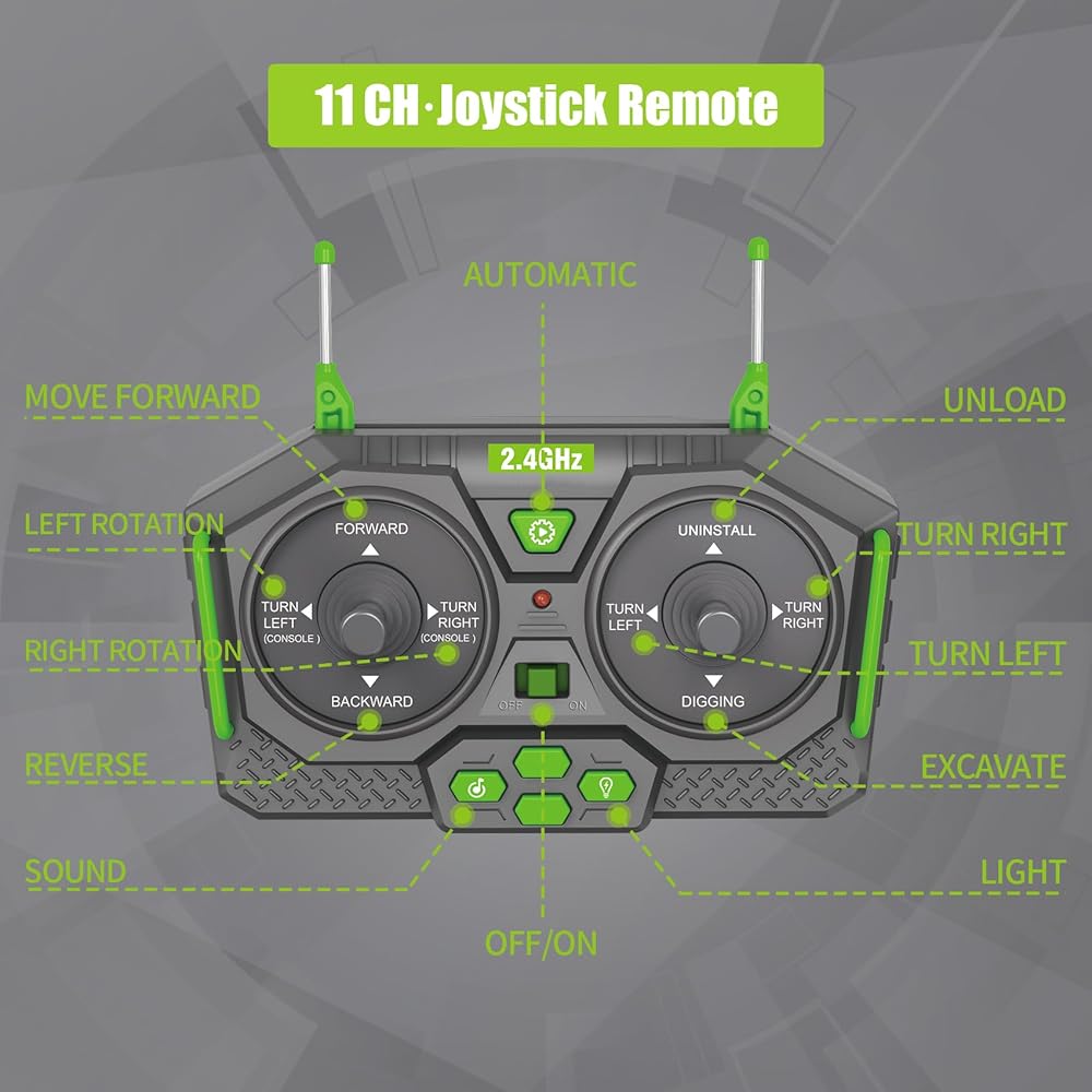 【Multi-Channel Joystick Will 】Make toy excavators flexible to dig, carry, lift, and/or maneuver in other ways. Channels can be operated individually or together.